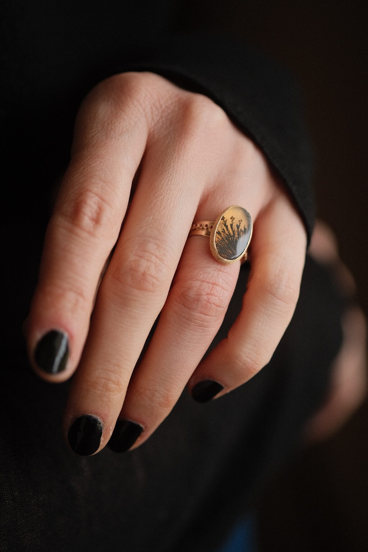 This handcrafted statement ring features a stunning dendritic agate set in solid 14k gold. Its natural, branch-like inclusions give the stone a mystical, landscape-like quality—each one entirely unique. On each side of the bezel, five tiny natural rubies are flush-set into the gold band, offering a hint of color and a refined touch.