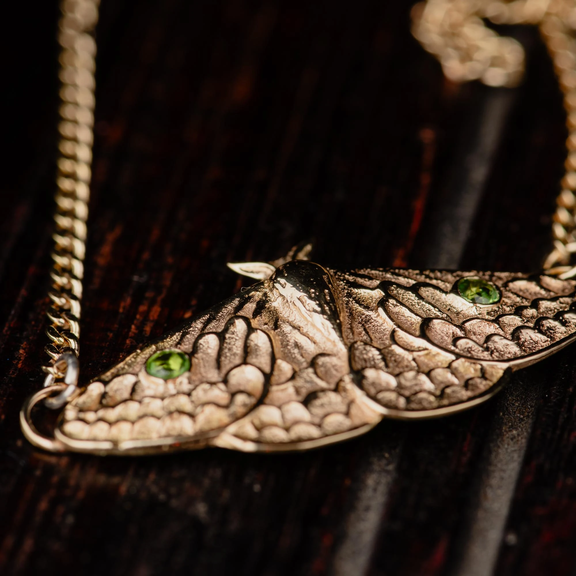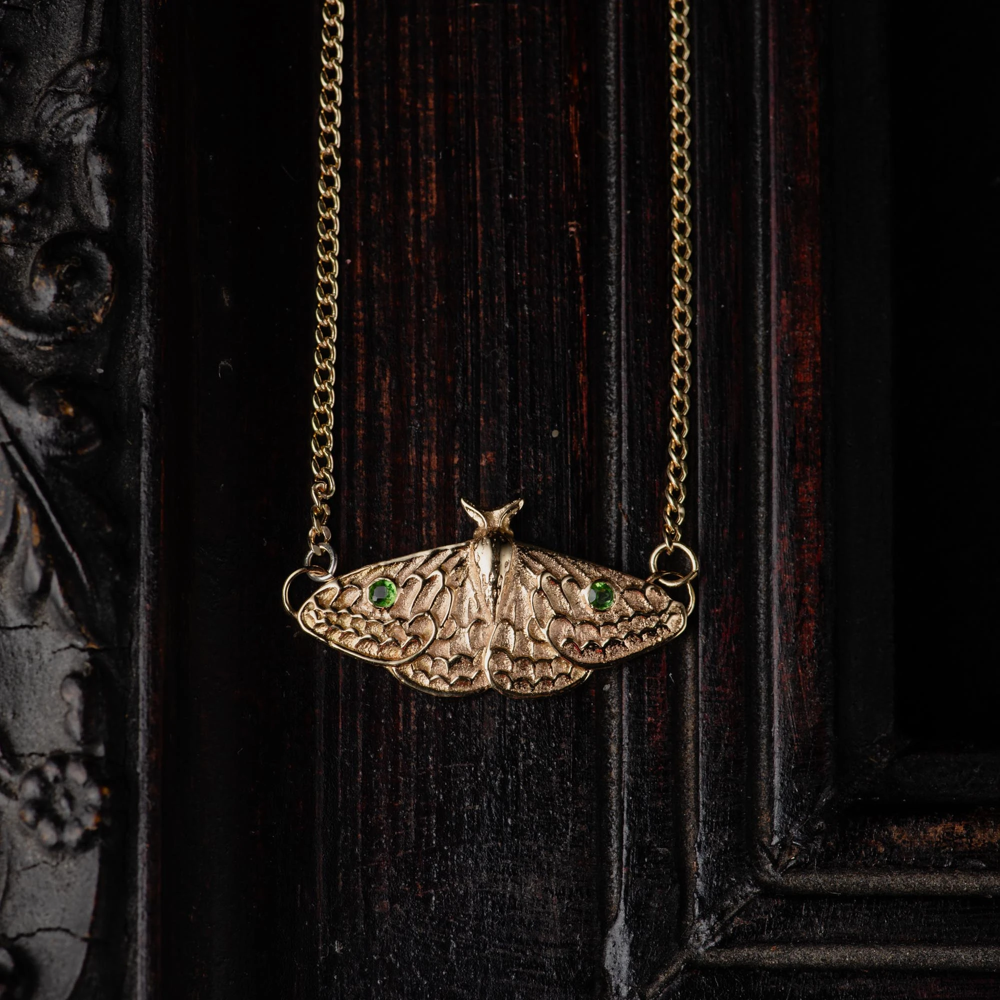 The moth itself is balanced and symmetrical, with carefully carved wing details that give it depth without feeling heavy. On each side, a small green tourmaline is set into the wings—subtle but intentional. Green tourmaline is often connected with emotional balance, grounding, and a sense of renewal, making it a quiet but meaningful addition to the piece.