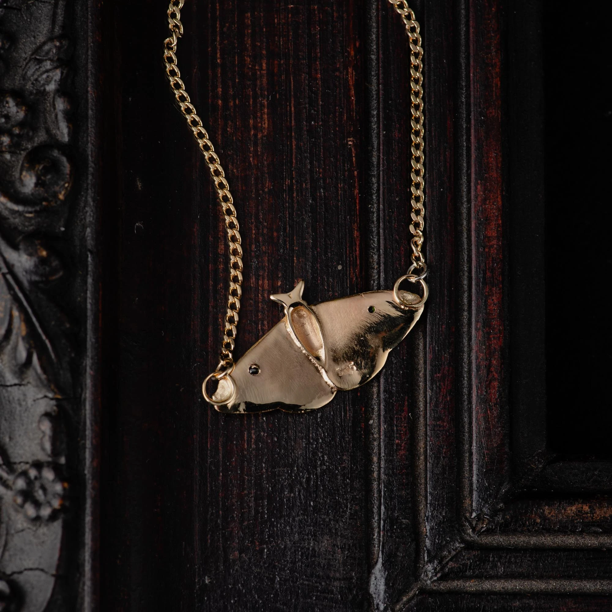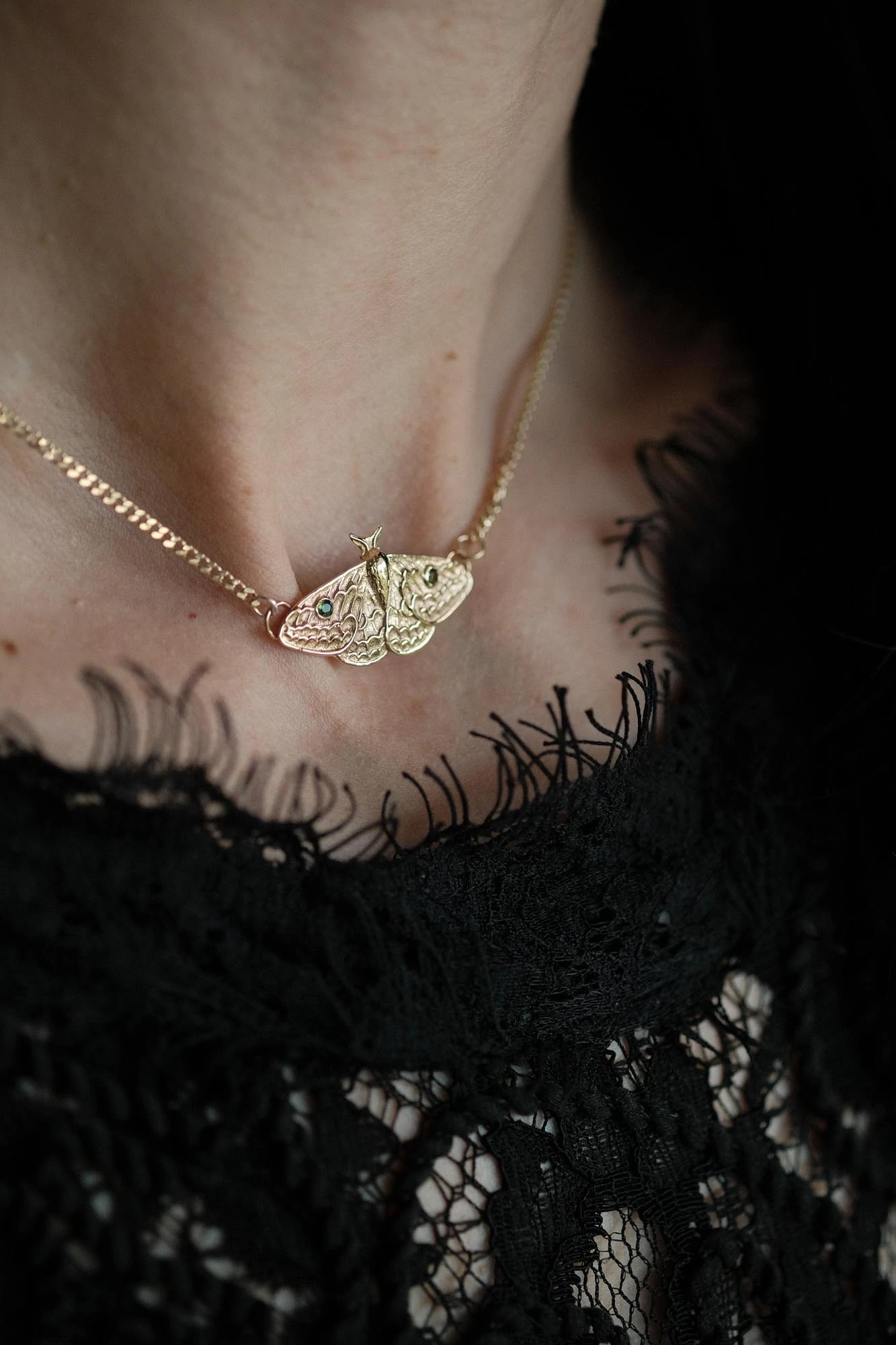 The moth is suspended between two fine gourmet chains, designed to sit close to the collarbone—almost like a soft choker. It works beautifully on its own as a statement piece, but also layers effortlessly with longer necklaces.
