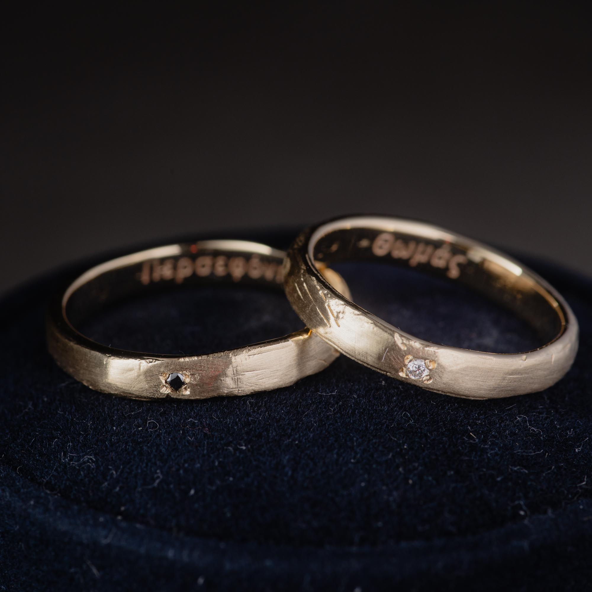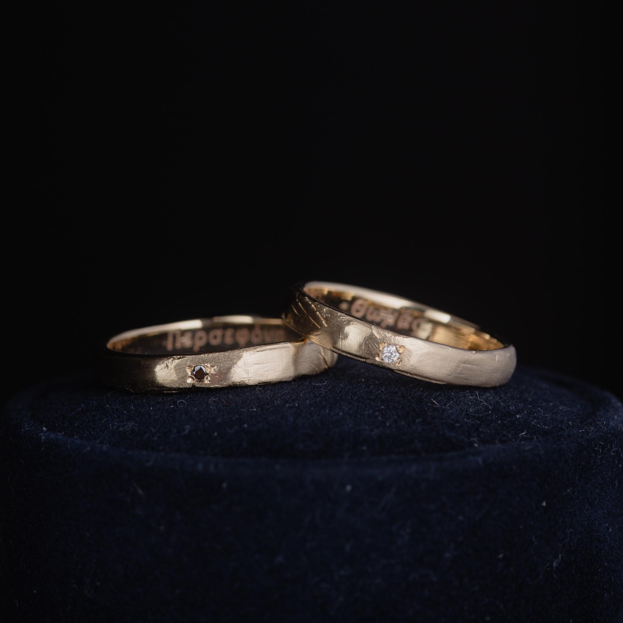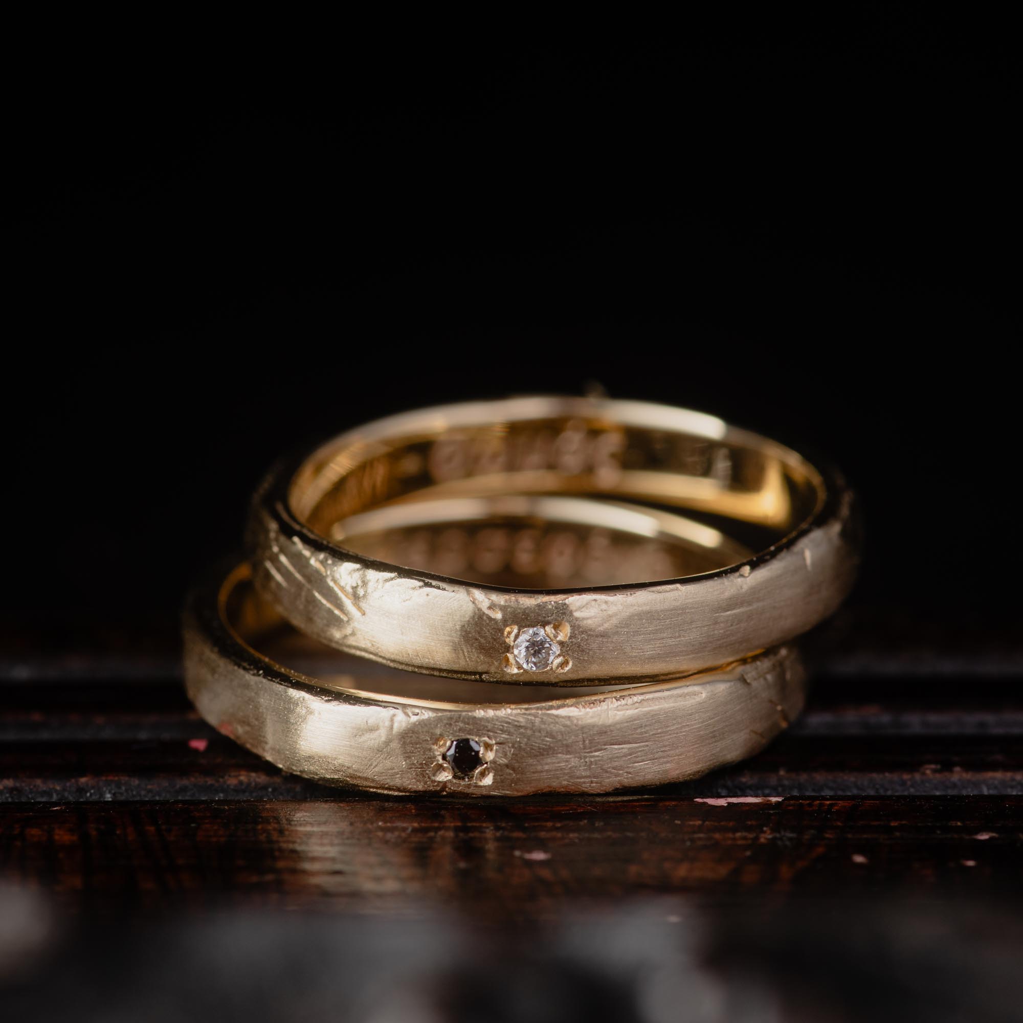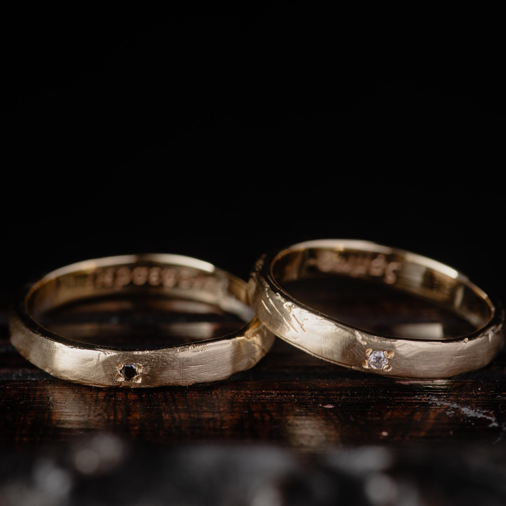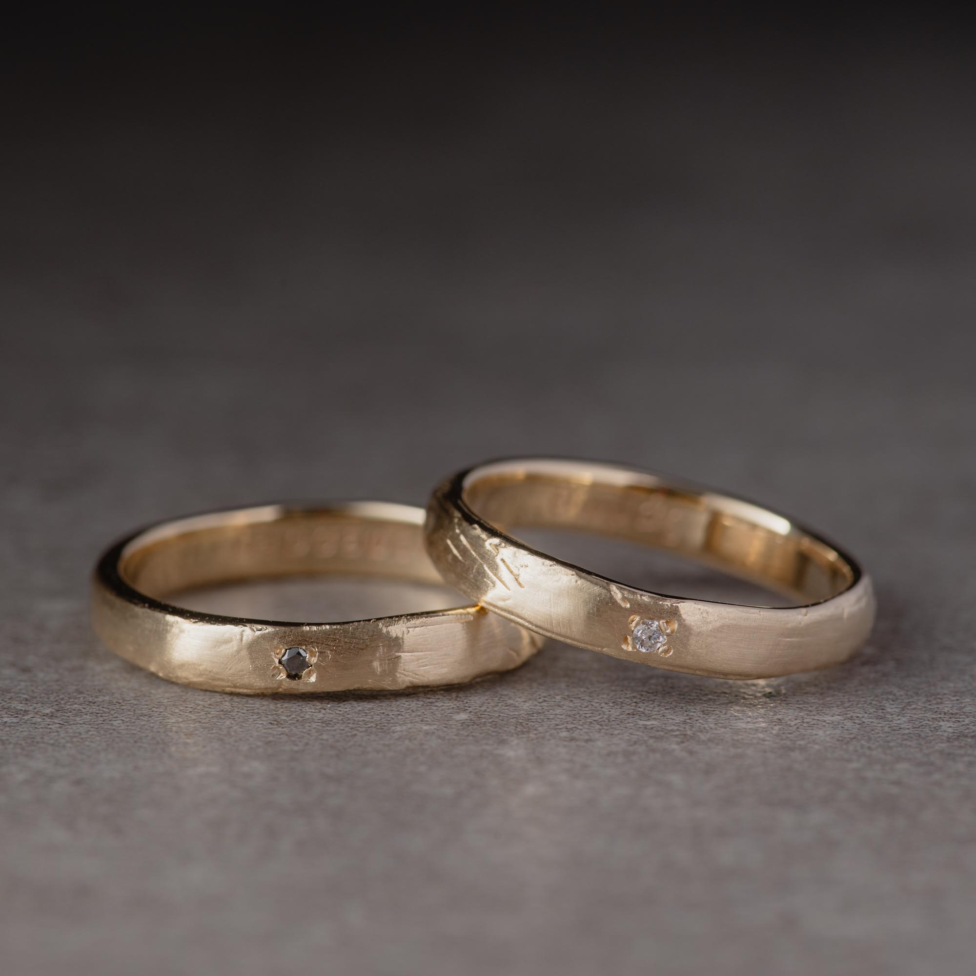 Two rings, one story, carved from wax, cast in solid 14K gold, and finished with your choice of a white or black diamond. These bands embrace organic imperfection and quiet strength, designed to be worn by anyone, for a lifetime.