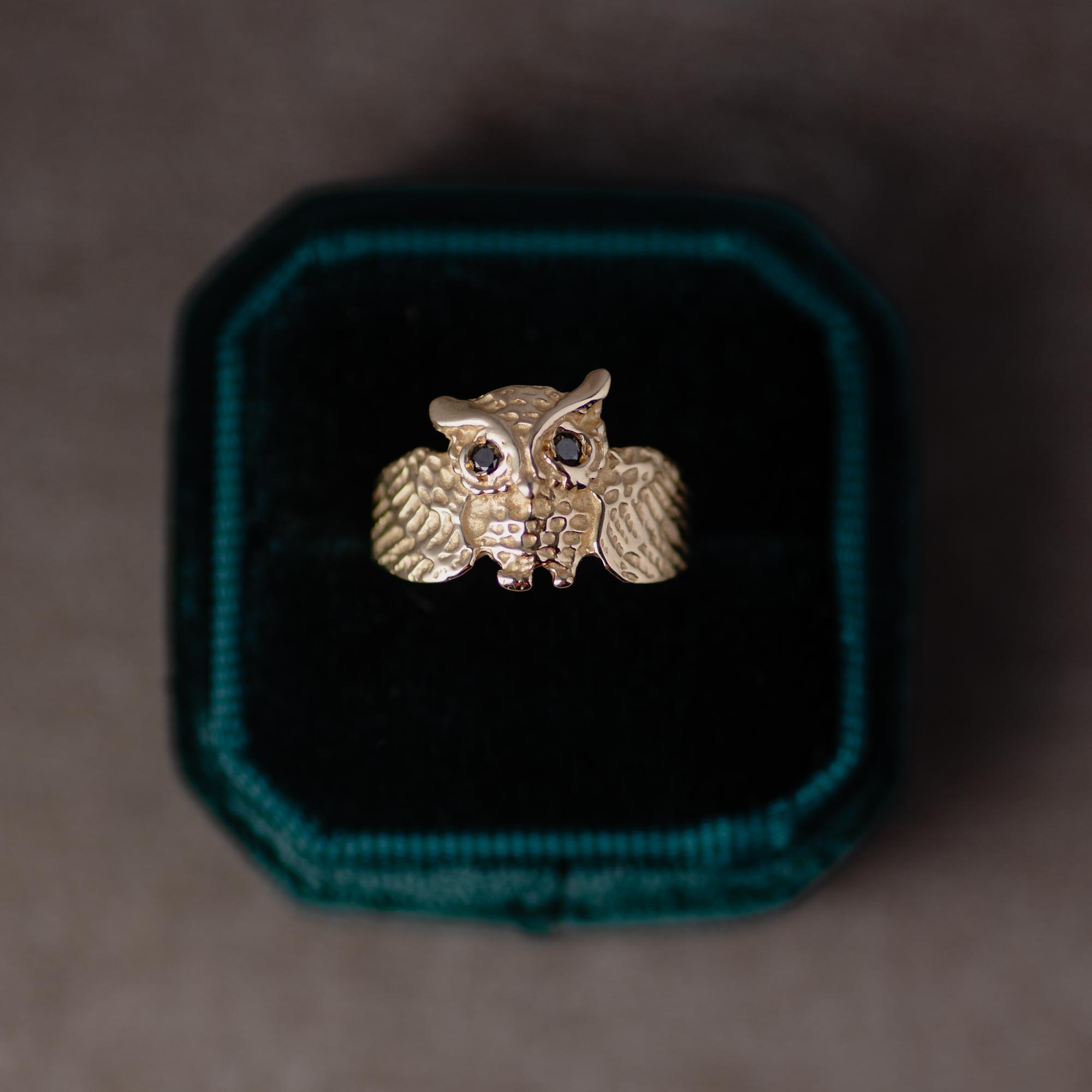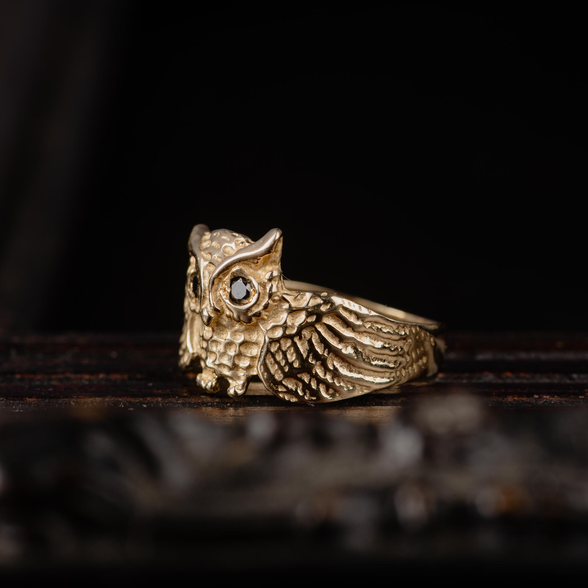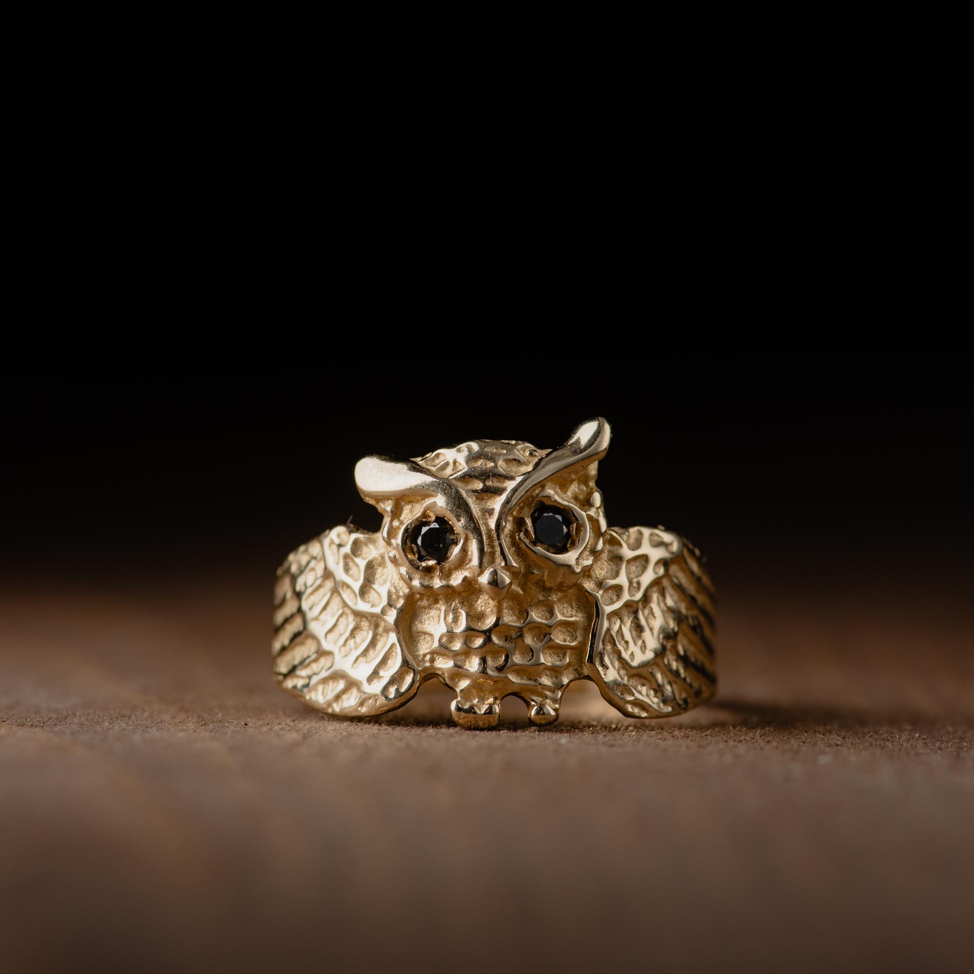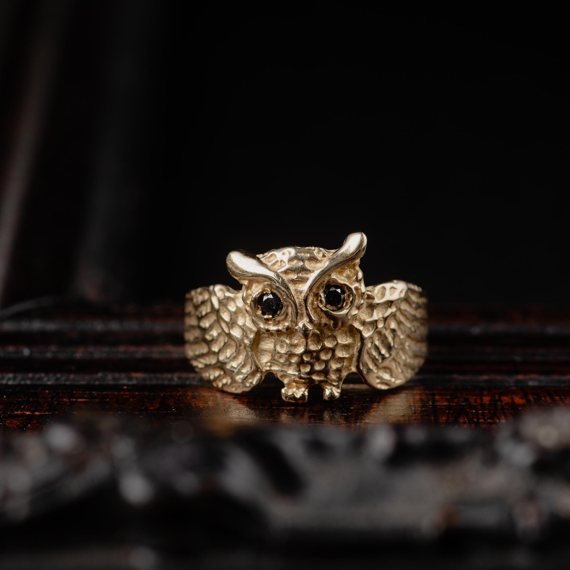 14K Solid Gold Owl Ring with Black Diamond Eyes