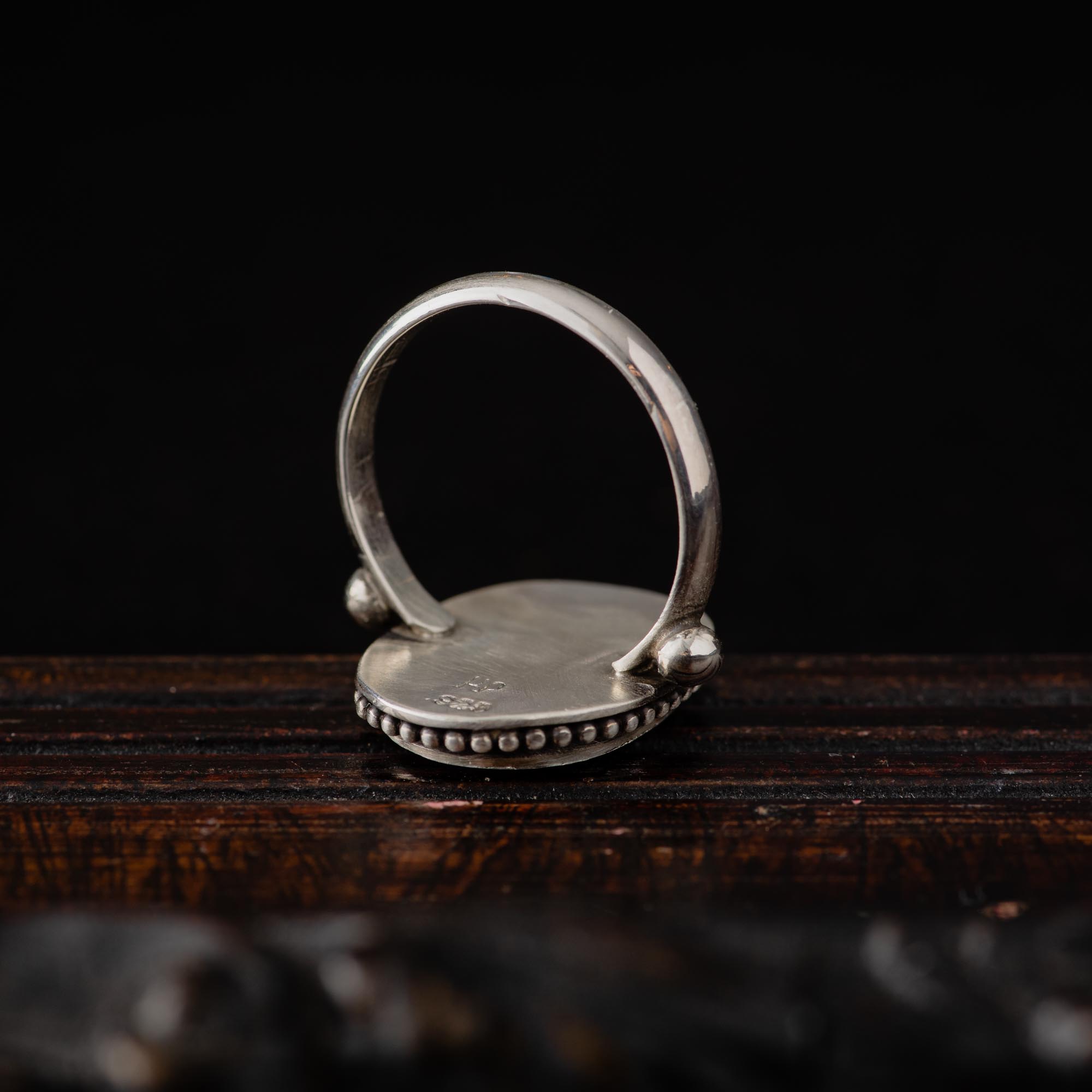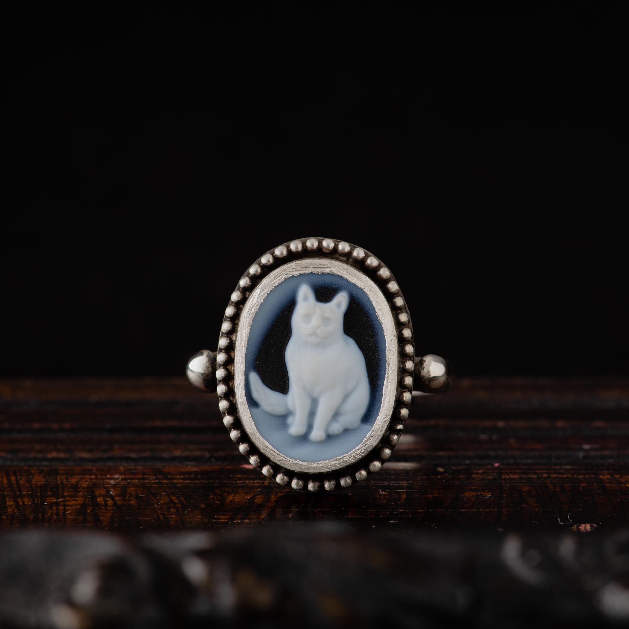 The unpretentious cat cameo takes center stage, showcasing a lovely kitten figure with classiness. Set in a simple .925 bezel, the cameo is beautifully framed with elaborate beaded wire and silver dots. These decorative elements add texture and visual interest to the ring, elevating its design with sheer detailing.