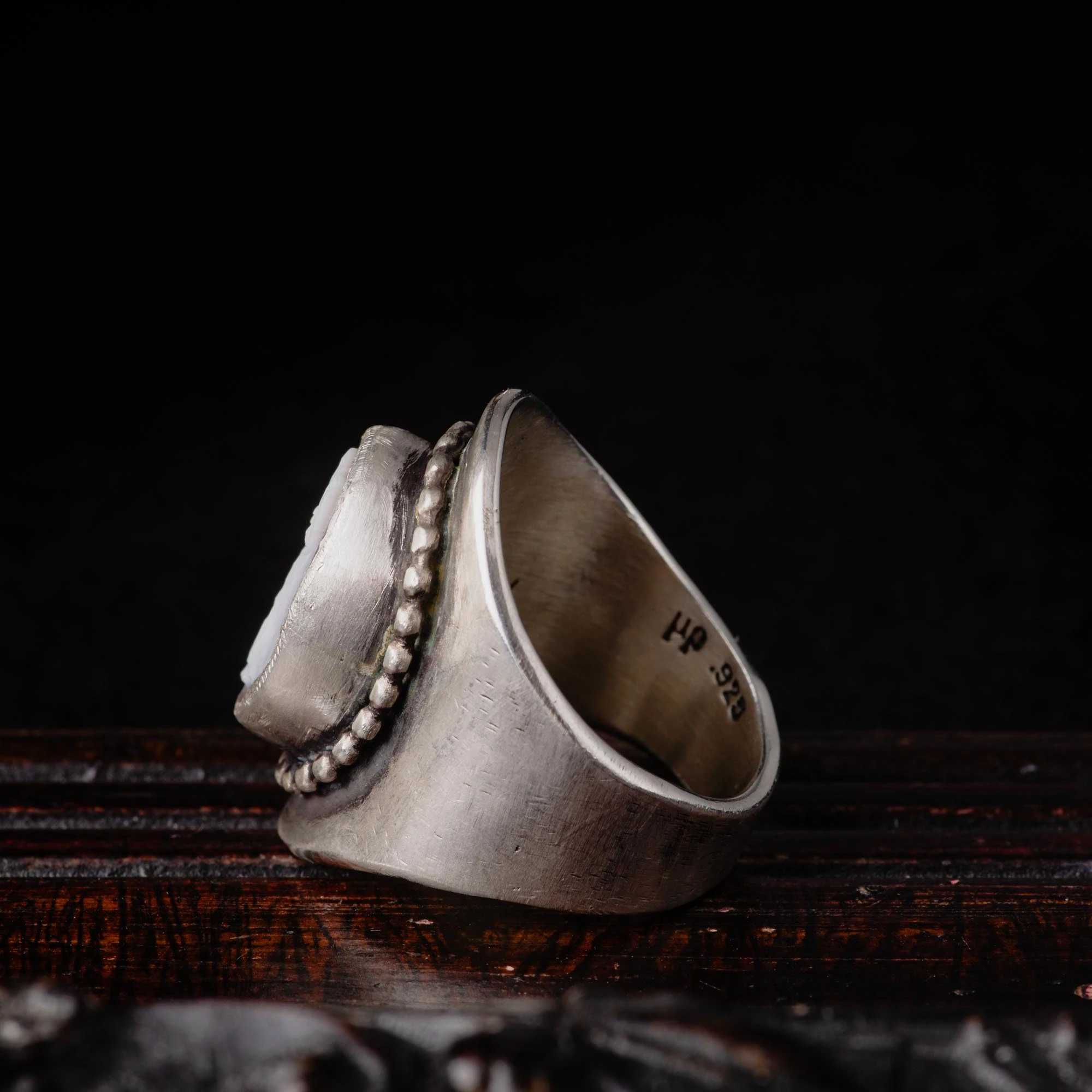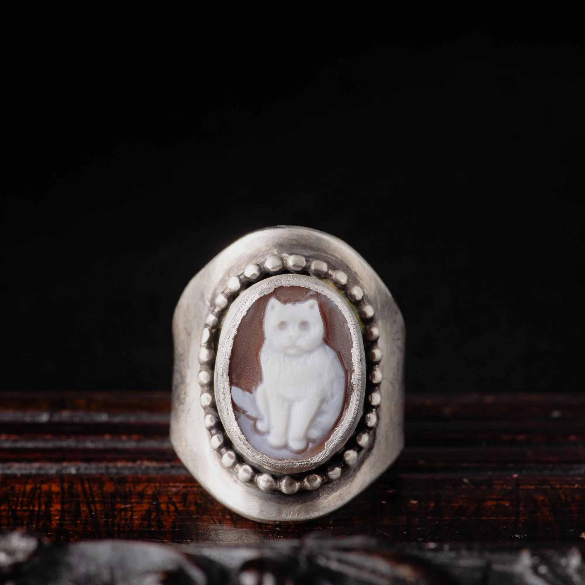 Surrender in the enchanting world of Victorian-inspired charm with our Cat Shell Cameo Sterling Silver Wide Ring. This handcrafted piece captures the essence of timeless elegance and whimsical beauty.