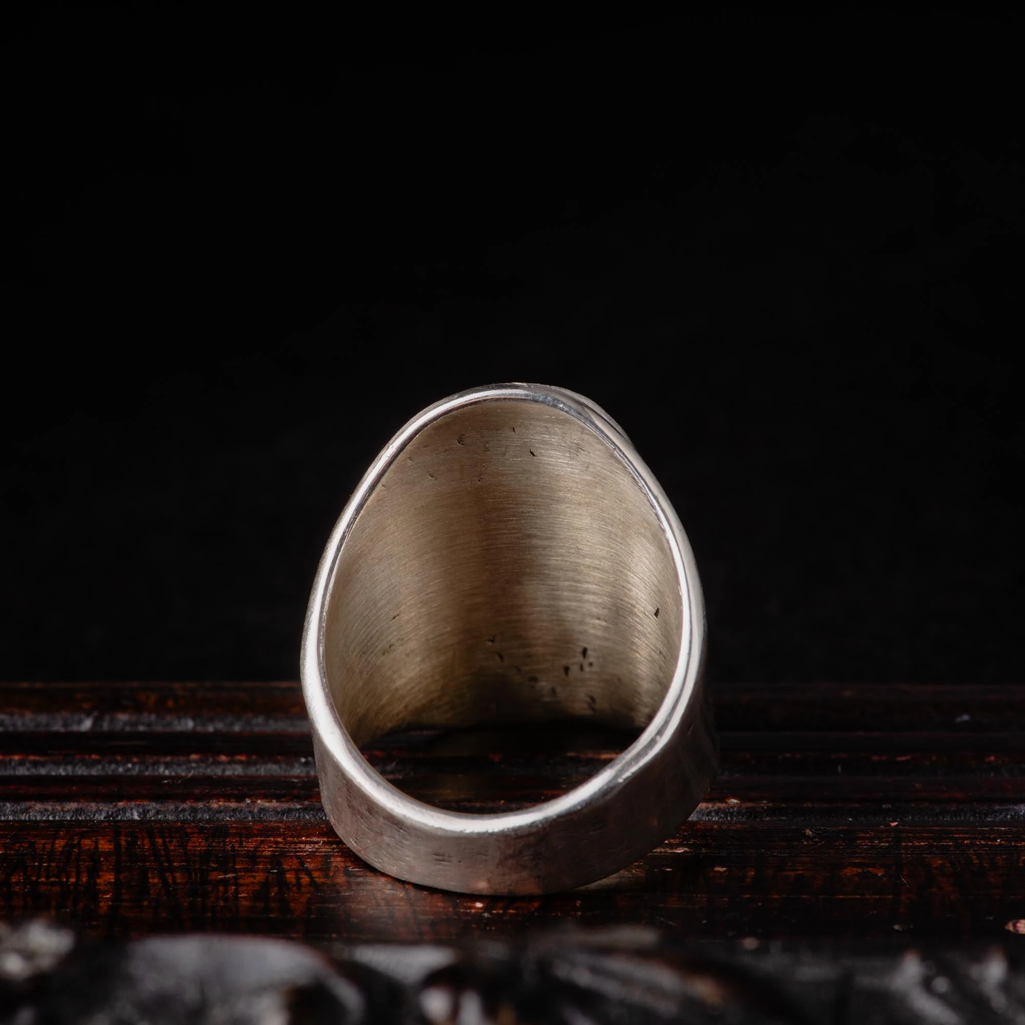 The ring features a wide front design that tapers towards the back, ensuring a comfortable fit for everyday wear. Crafted with sterling silver, it undergoes an oxidized and brushed finish to achieve an antiqued appearance that adds a touch of vintage allure.