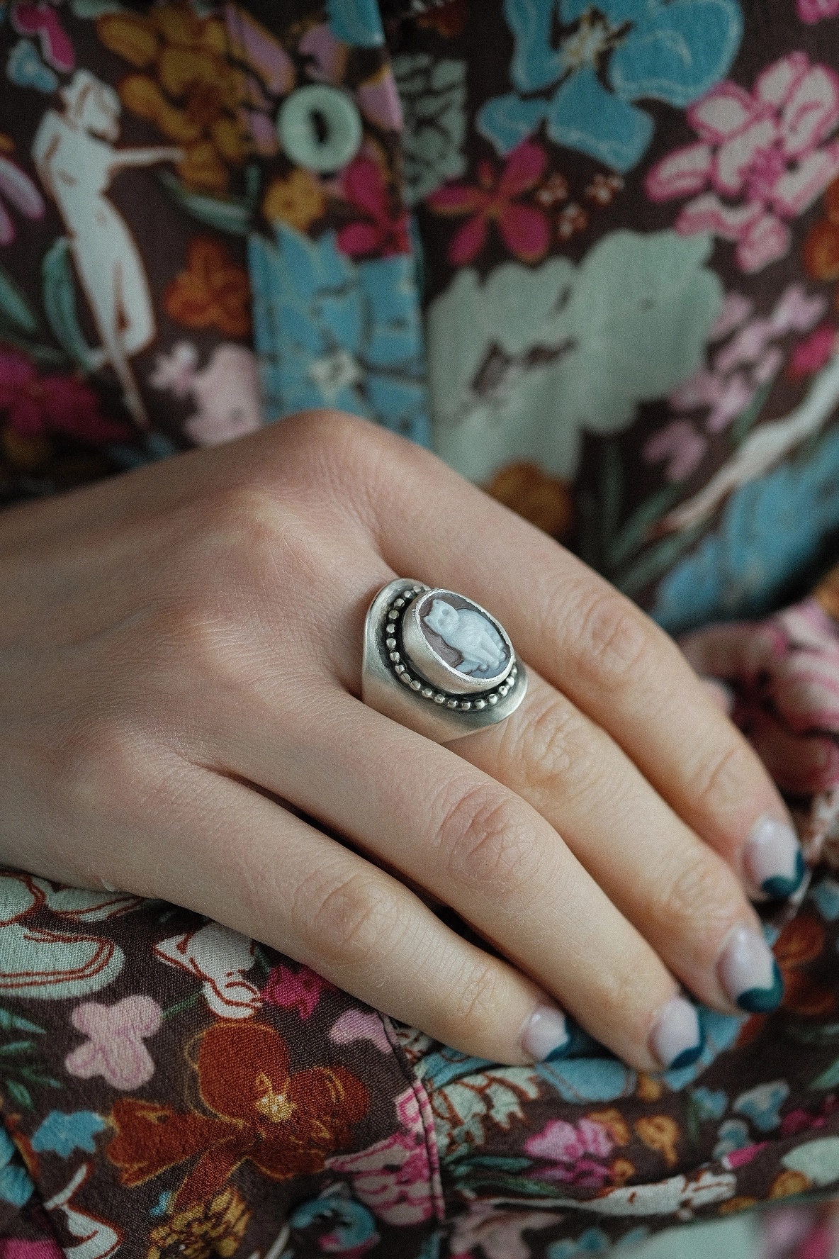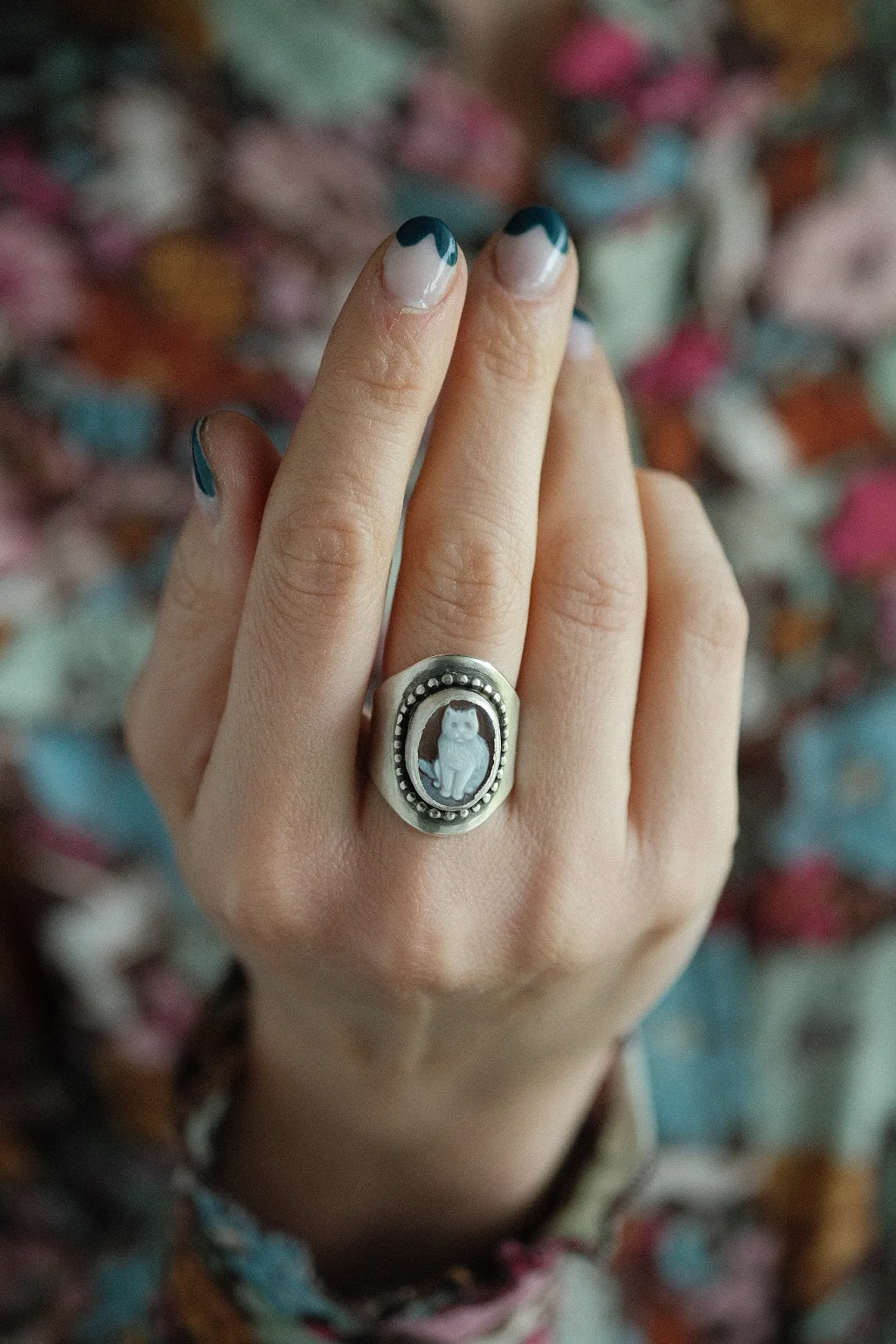 A delightful cat cameo rests at the ring’s centerpiece, carefully carved on a beautiful carved shell. The details of the cat figure bring a sense of whimsy and playfulness to the ring, making it a perfect choice for cat lovers or anyone who appreciates the artistry of jewelry.