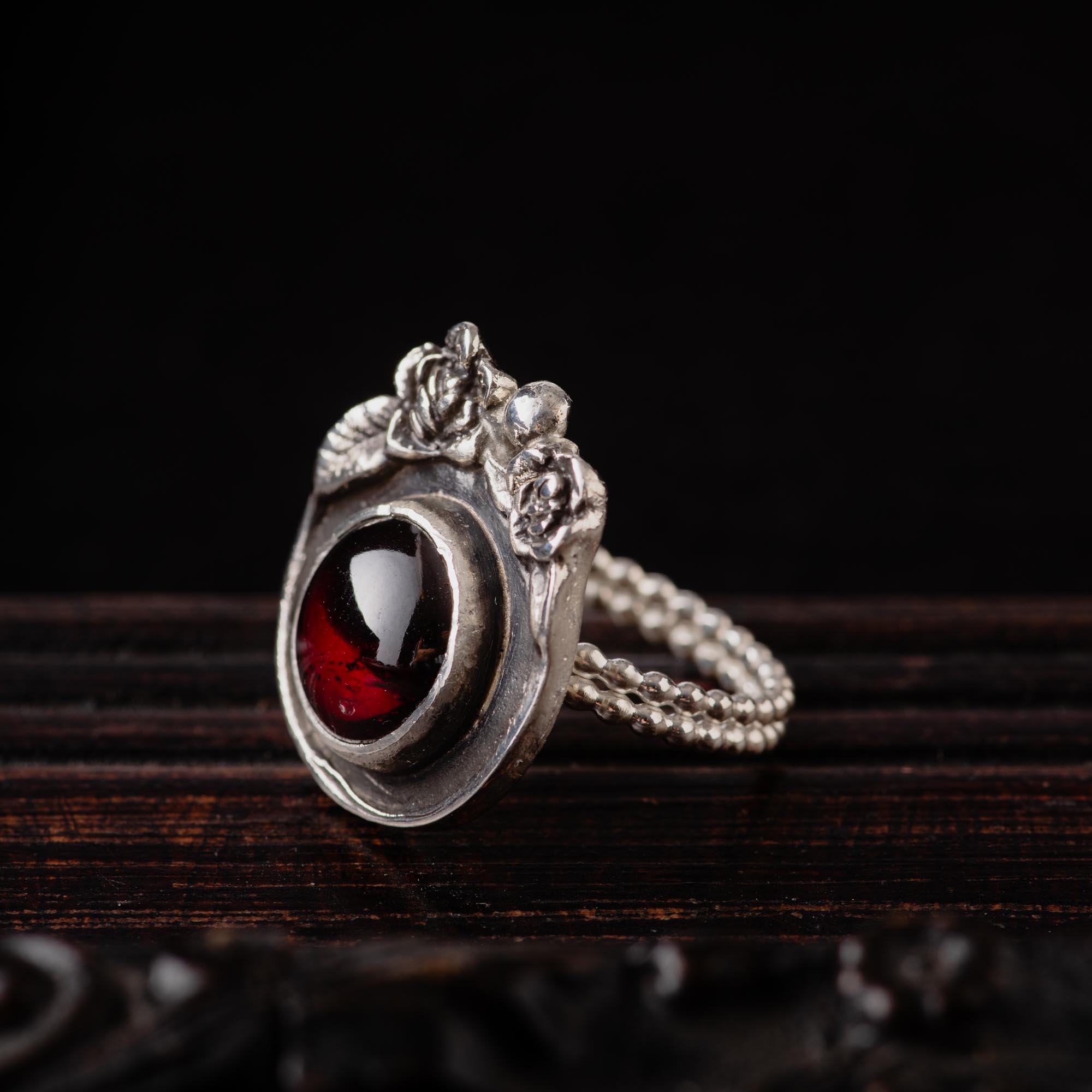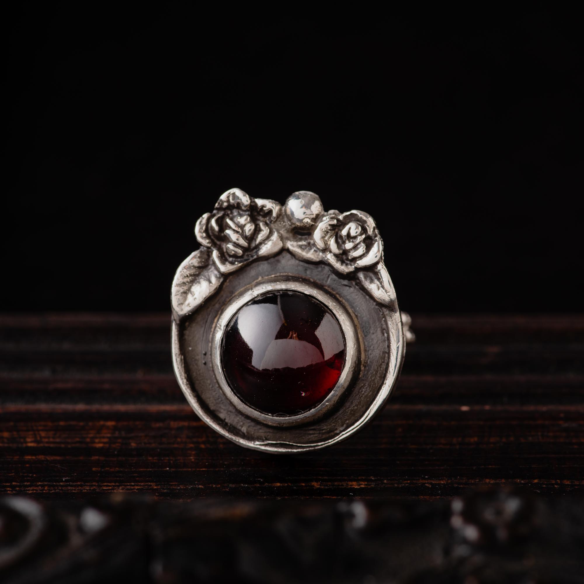 This handcrafted ring features a deep wine-red garnet, elegantly adorned with two delicate roses.