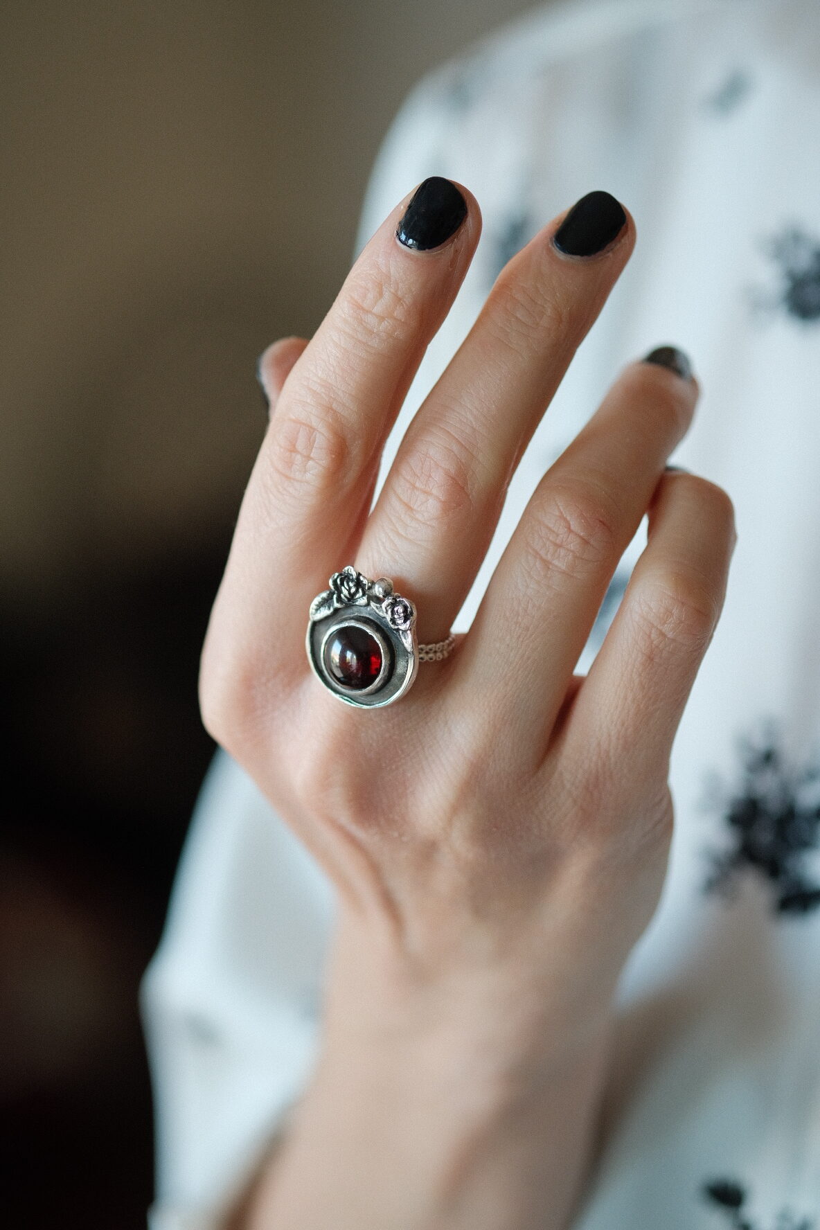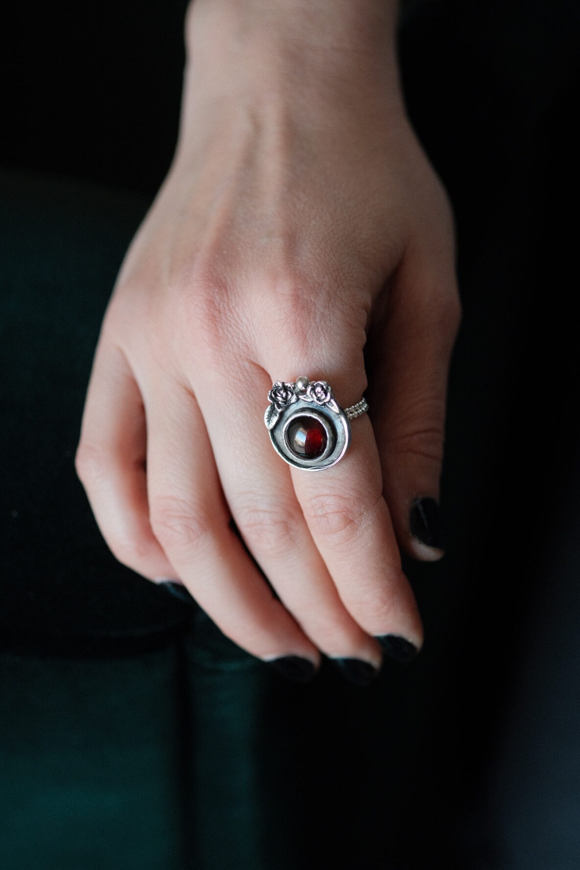 Embrace your dark romantic side with our new handcrafted garnet and roses sterling silver ring. The ring features a round deep wine red garnet in the center, surrounded by two finely crafted roses.