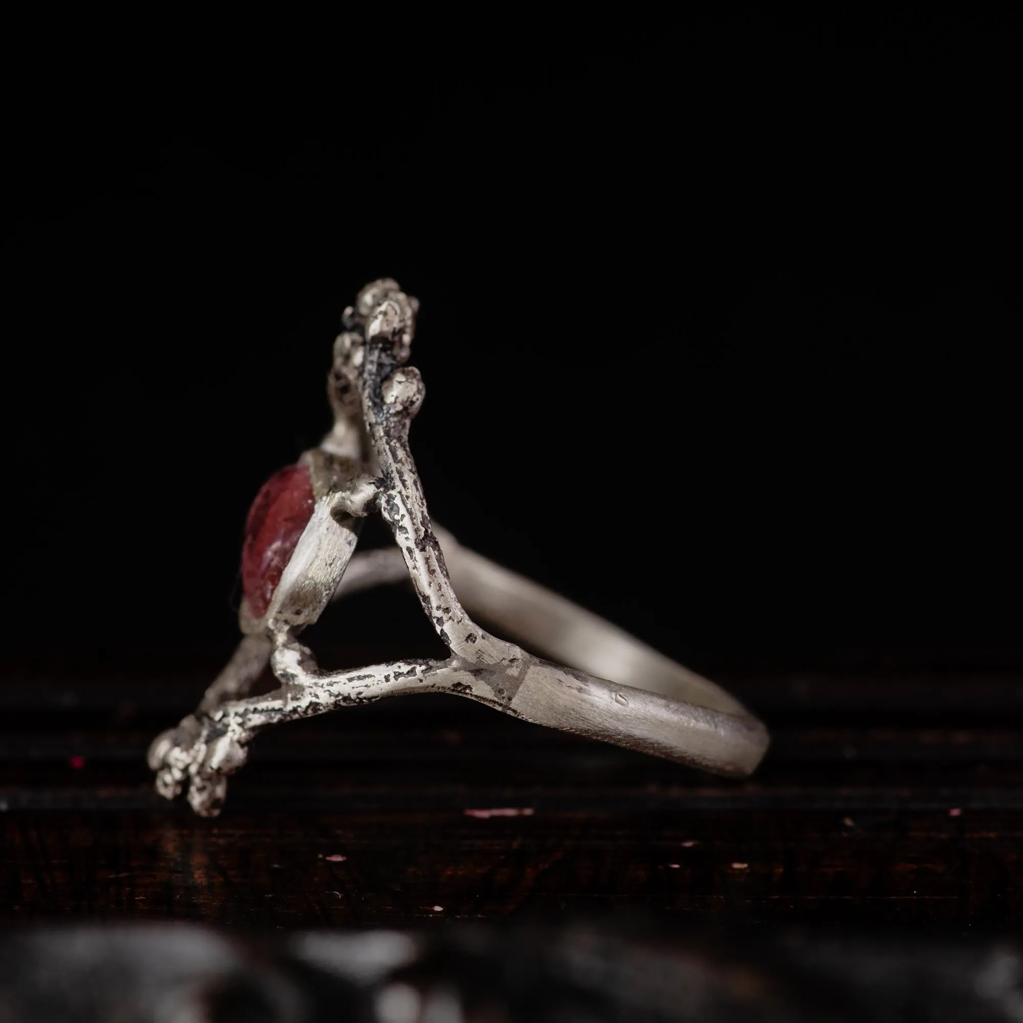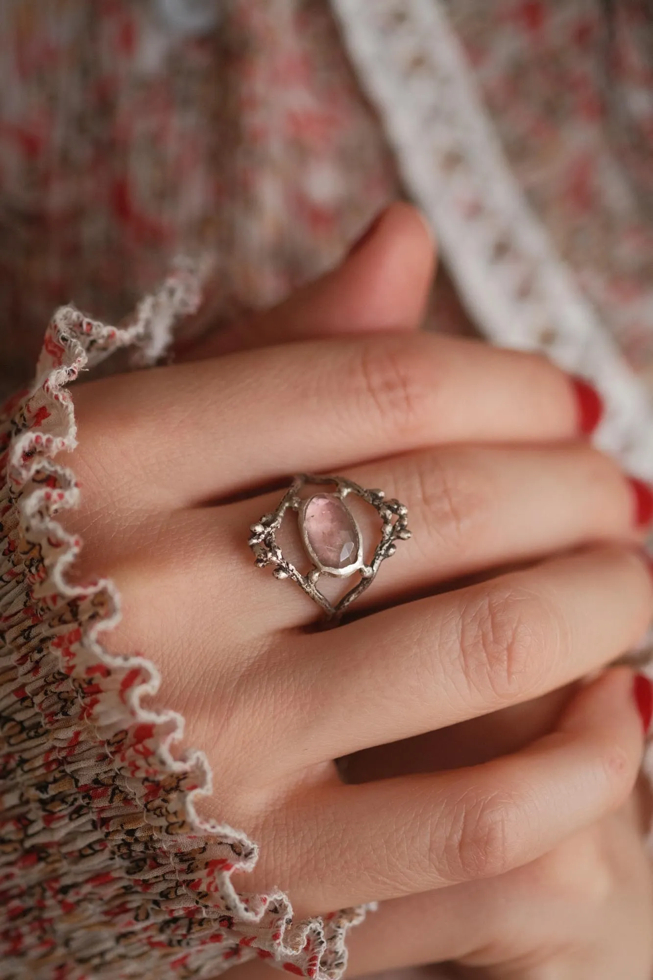 Although similar twig rings can be made with different stones, this exact version cannot be repeated. The way the silver grew around these twigs, the specific tone of this pink tourmaline, they belong to this piece alone.