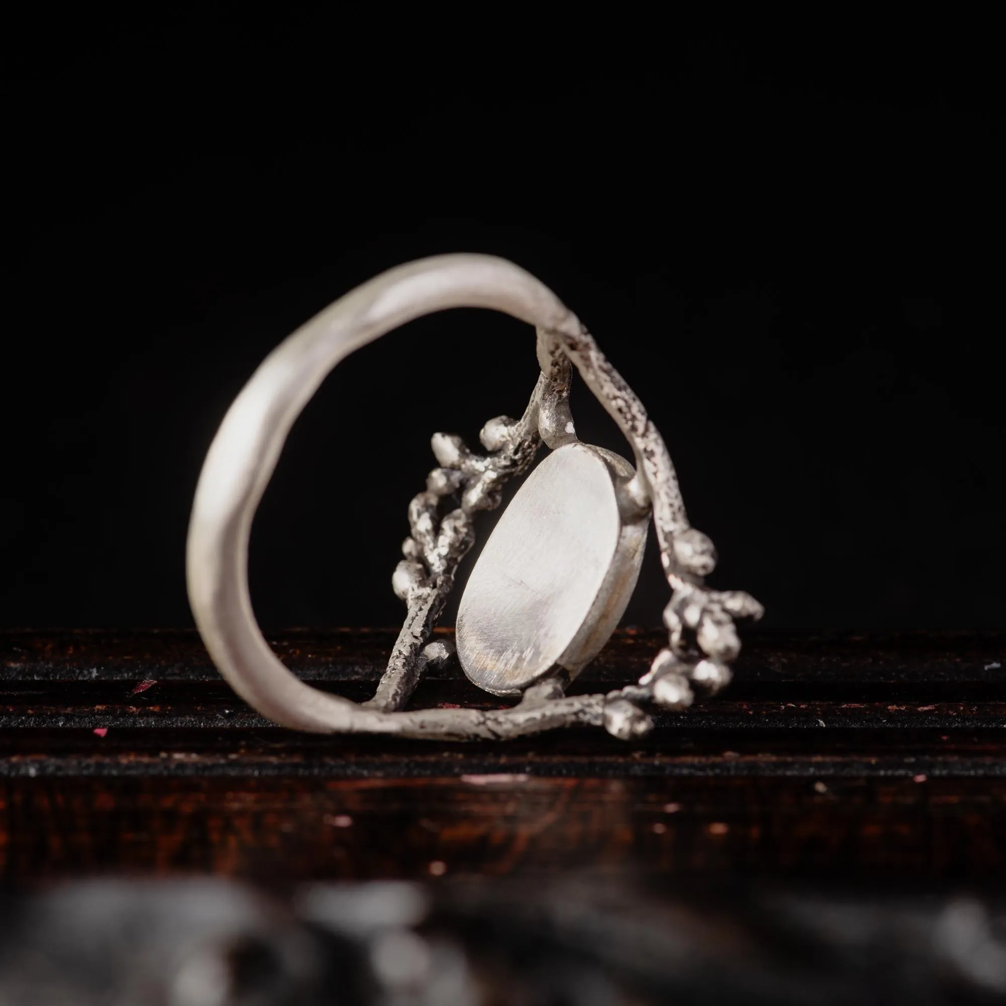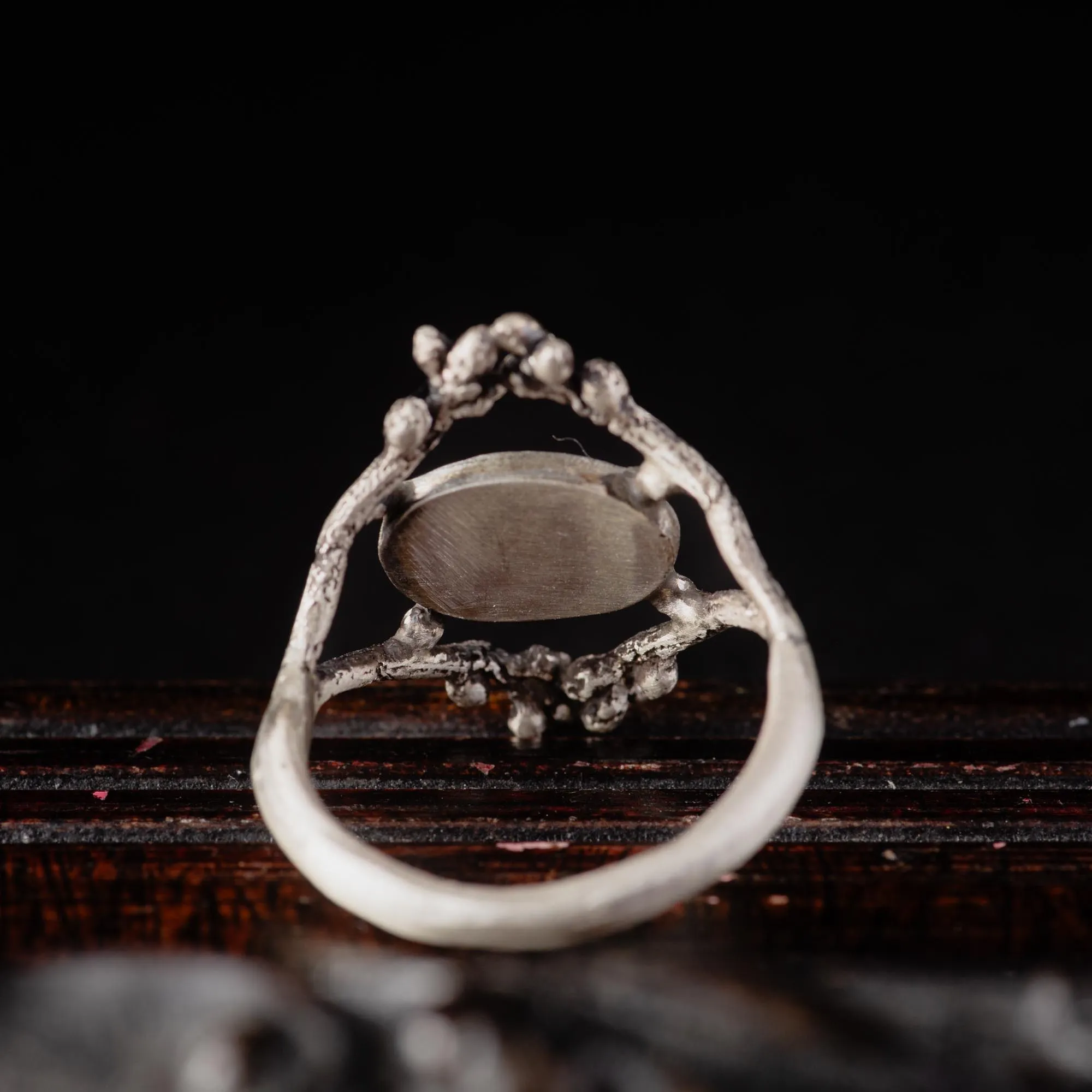 The design leans romantic, but never dainty. There’s something quietly gothic about it, not dark in mood, but rich in symbolism and presence. The shape of the ring, the openness of the band, and the way it wraps like something found deep in nature, all contribute to its emotional gravity. It doesn’t reference fairy tales; it feels like one — untold and unpolished.