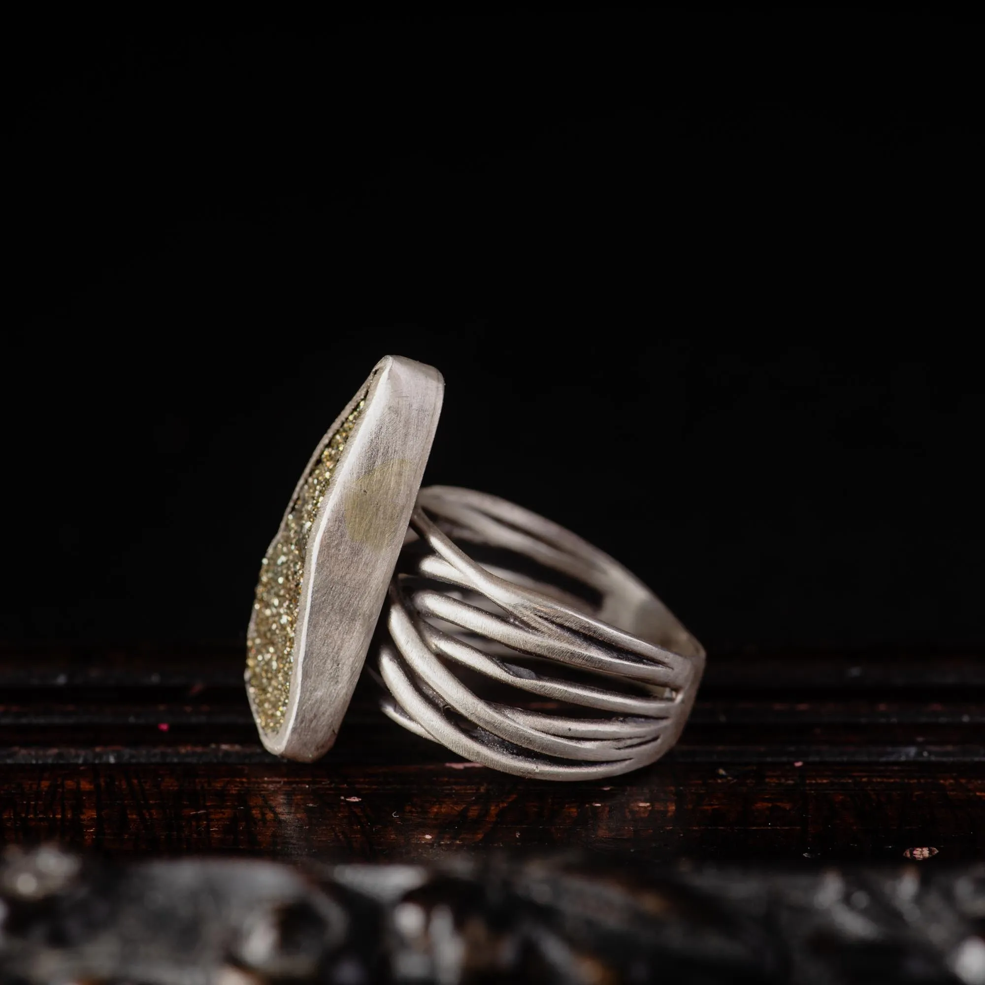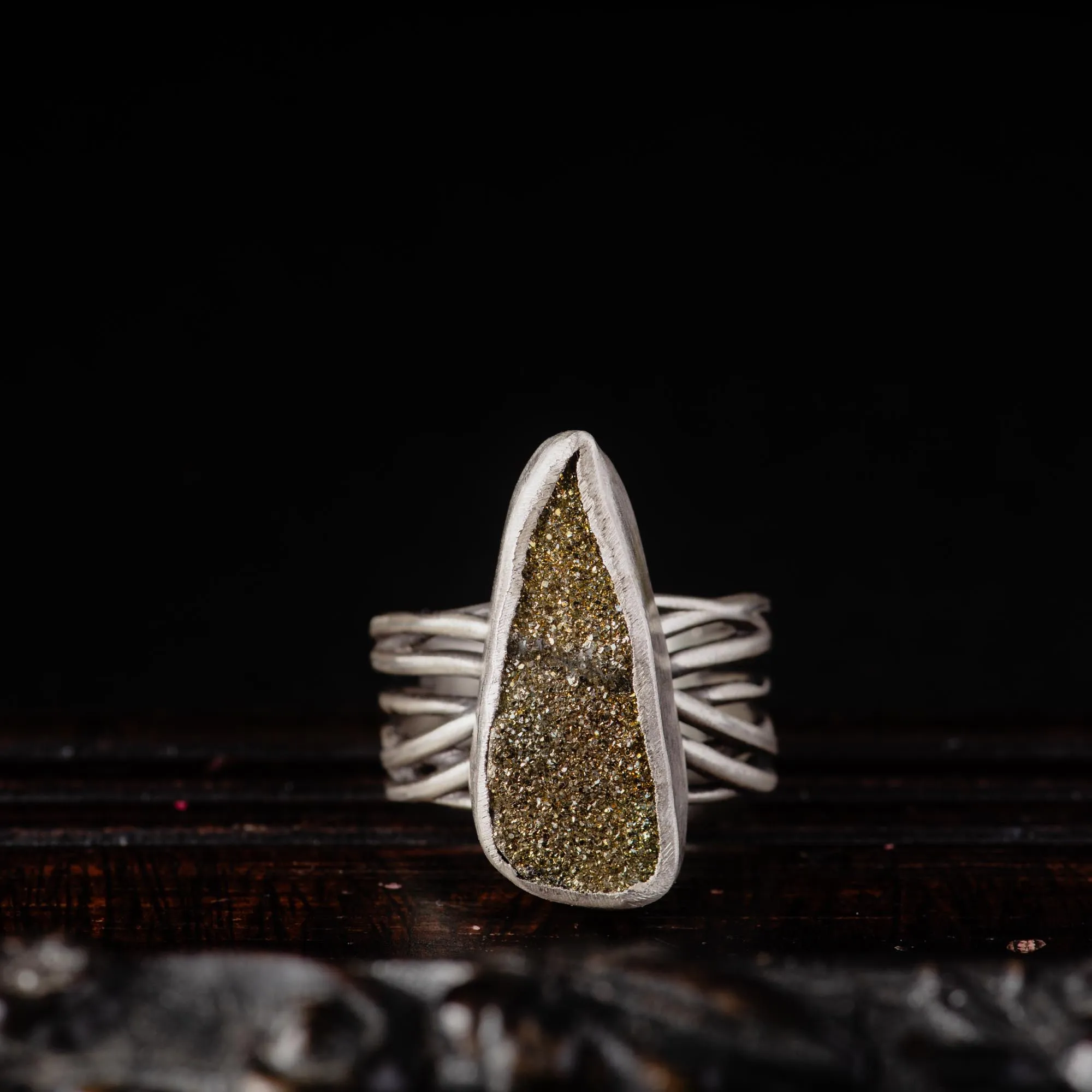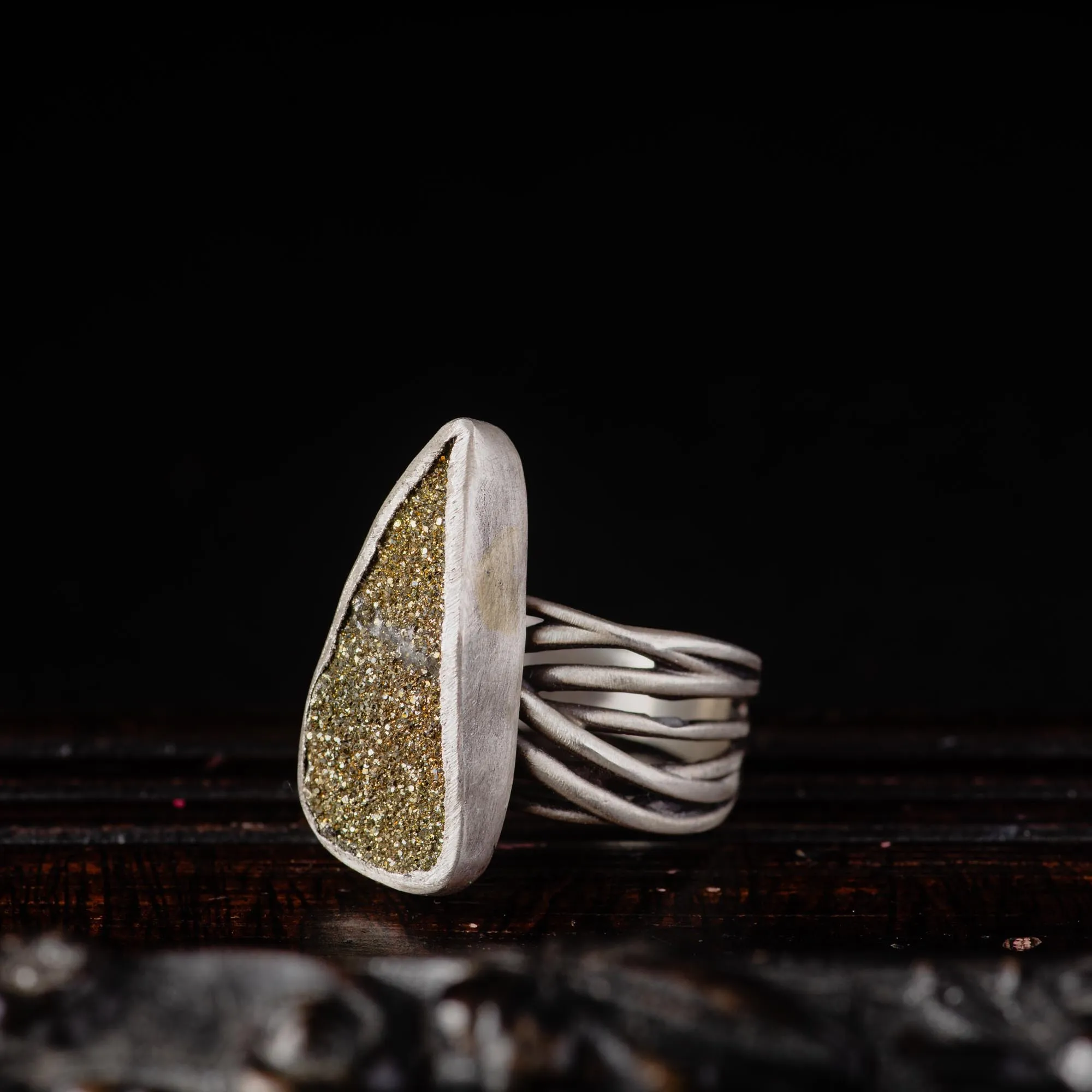 Handcrafted in sterling silver, this one-of-a-kind, Raw Pyrite Sterling Silver Ring features a sculptural band made of multiple silver wires, soldered together. The result is a rhythm of lines and light, an almost musical quality under the fingers.