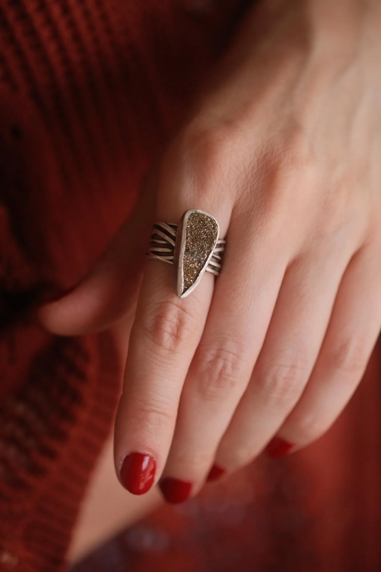 The Raw Pyrite Sterling Silver Ring is built around contrast: soft hand-shaped silver wires, wrapped and layered, hold a raw pyrite with shimmering depth. The stone sits like a dark spark—green-brown in shadow, golden in light, textured like fine dust turned to metal. It’s nearly triangular, yet far from perfect. Everything about this ring is deliberate in its irregularity. Sterling silver gives it weight, while the wire band brings air and rhythm.