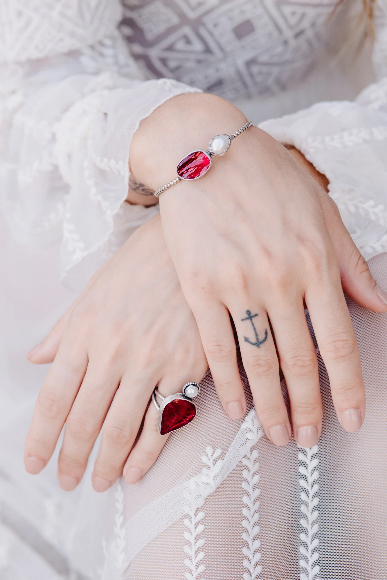 Uplift your style and add mysticism to your jewelry collection with our Ruby and Pearl Sterling Silver Ring. Whether worn alone or paired with other pieces, this eye-catching ring is destined to become a cherished favorite in your accessory lineup.