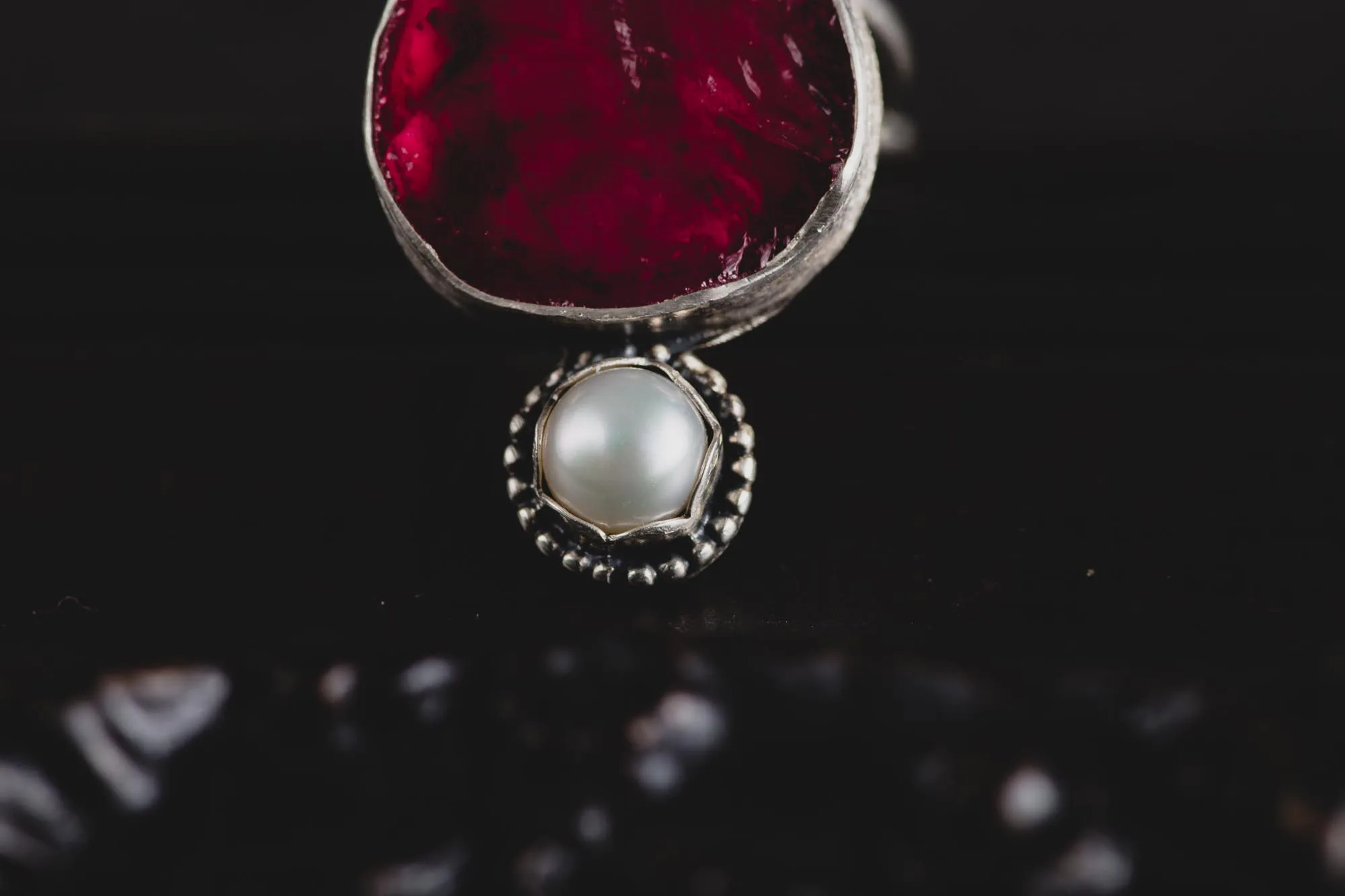 Indulge in the beauty of our Ruby and Pearl Sterling Silver Ring. This ring combines a deep wine-red ruby and a lustrous white freshwater pearl, harmoniously brought together in a statement piece that will capture your heart.
