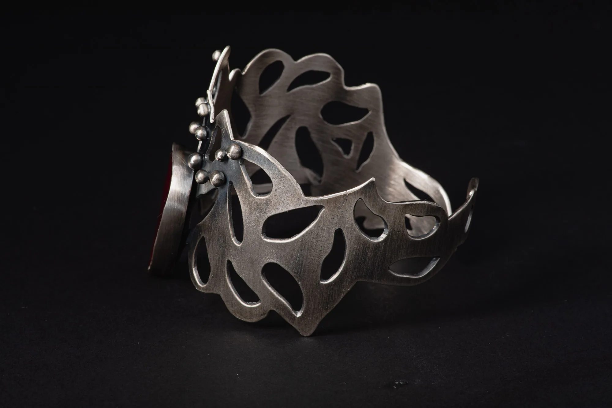 At its center, a stunning teardrop-shaped deep red ruby adds a touch of mesmerizing appeal, symbolizing passion and vibrancy. The combination of abstract elements and the rich hue of the ruby makes this cuff genuinely unique and eye-catching.