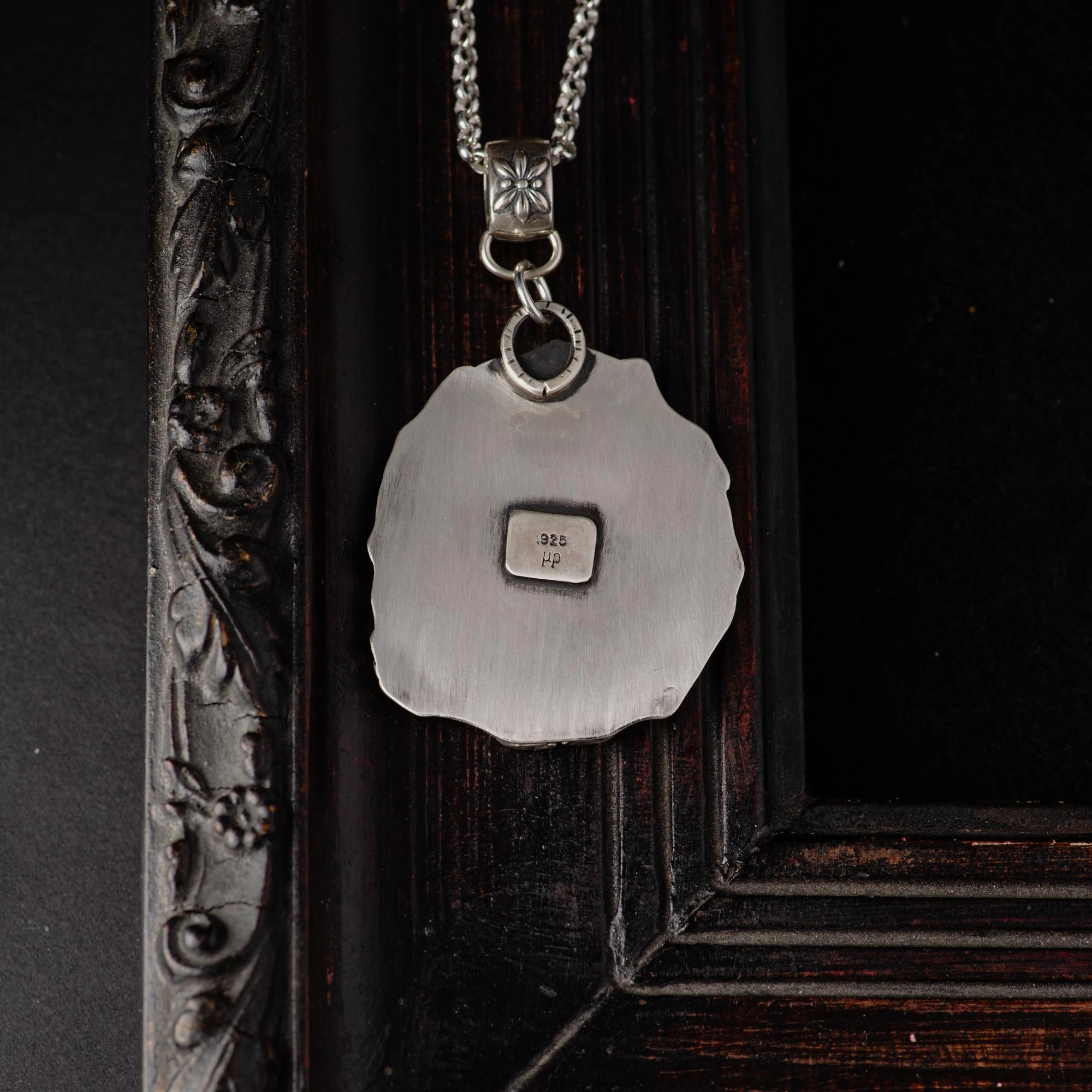 Due to its size and weight, the pendant is paired with a thick 45 cm sterling silver chain, designed to hold it securely while keeping the proportions right on the body.