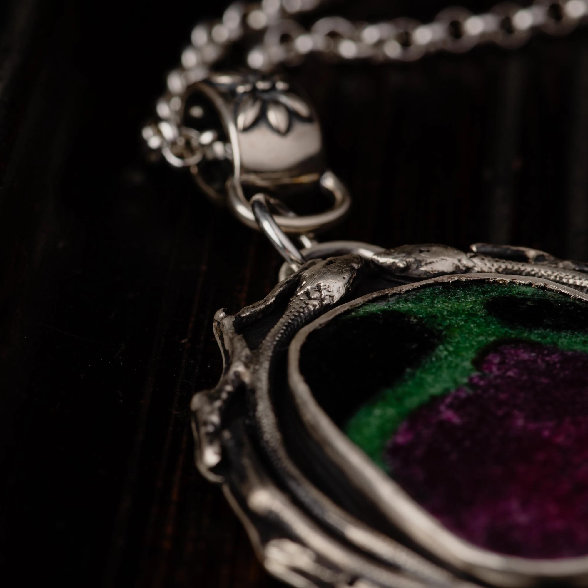 A bold, heavy pendant featuring a striking ruby zoisite stone, set in a fully handcrafted sterling silver setting. The deep green and rich ruby tones create a natural, almost landscape-like effect.