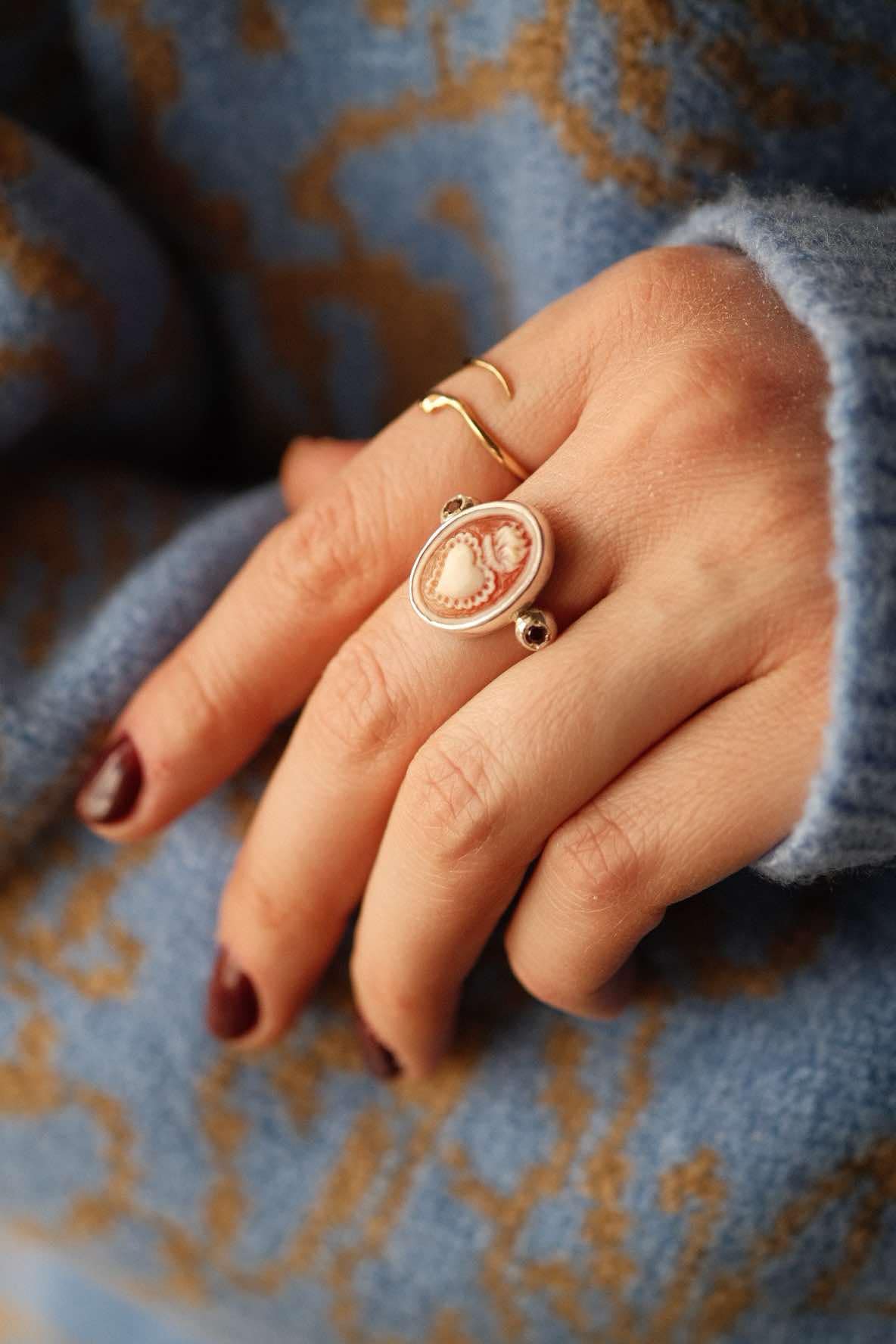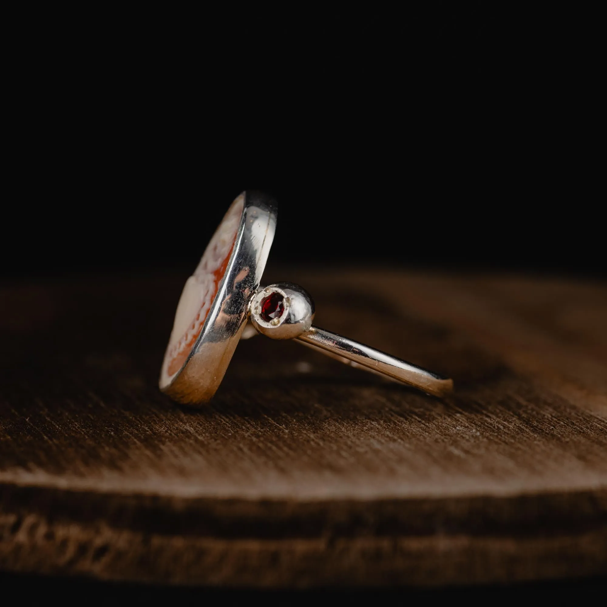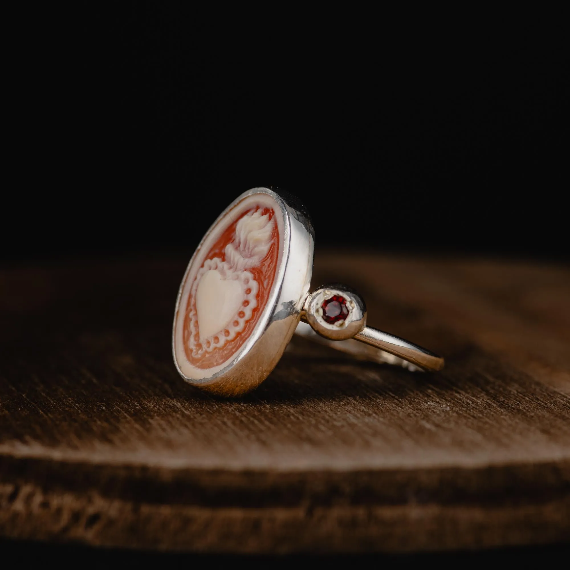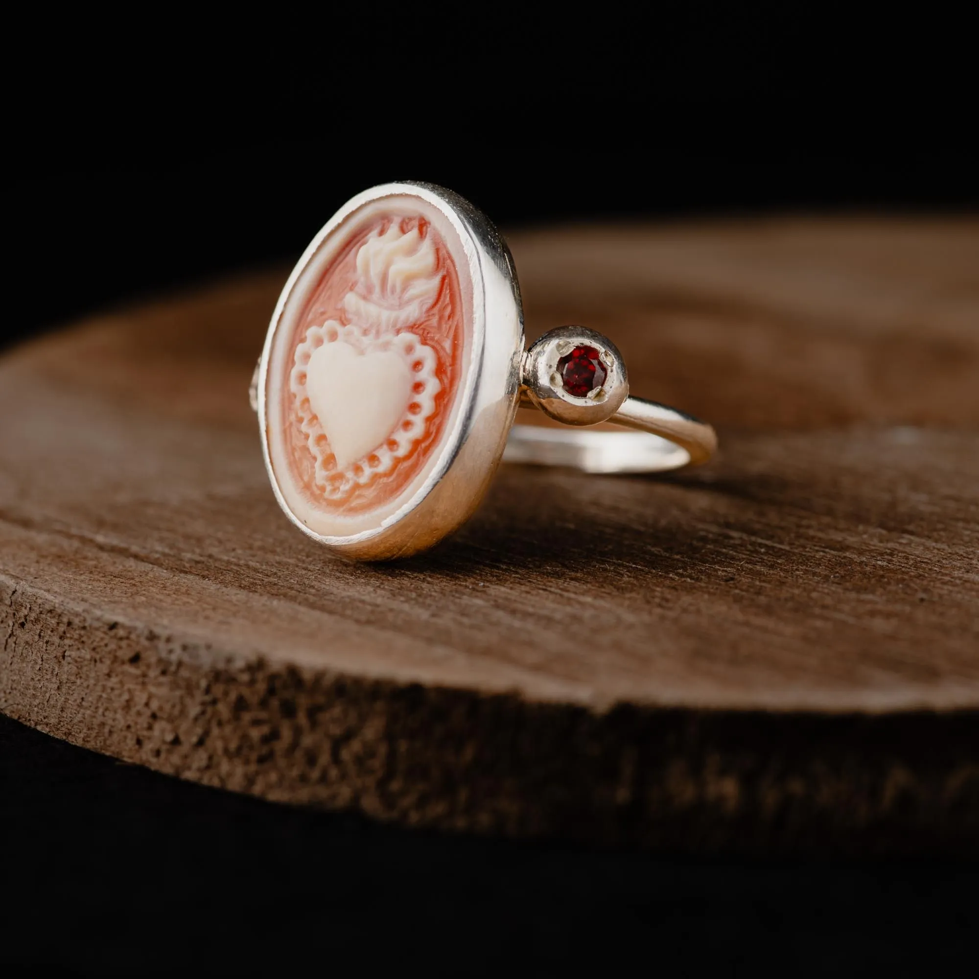 At its heart lies a genuine shell cameo with its warm orange hues depicting the image of a sacred heart—an emblem of devotion, strength, and the beauty of resilience. Framed in polished silver, it glows like an antique treasure, rich with history and soul. Flanking the cameo, two deep red garnets shimmer with a life of their own. Like droplets of wine, they catch the light with an irresistible glow.
