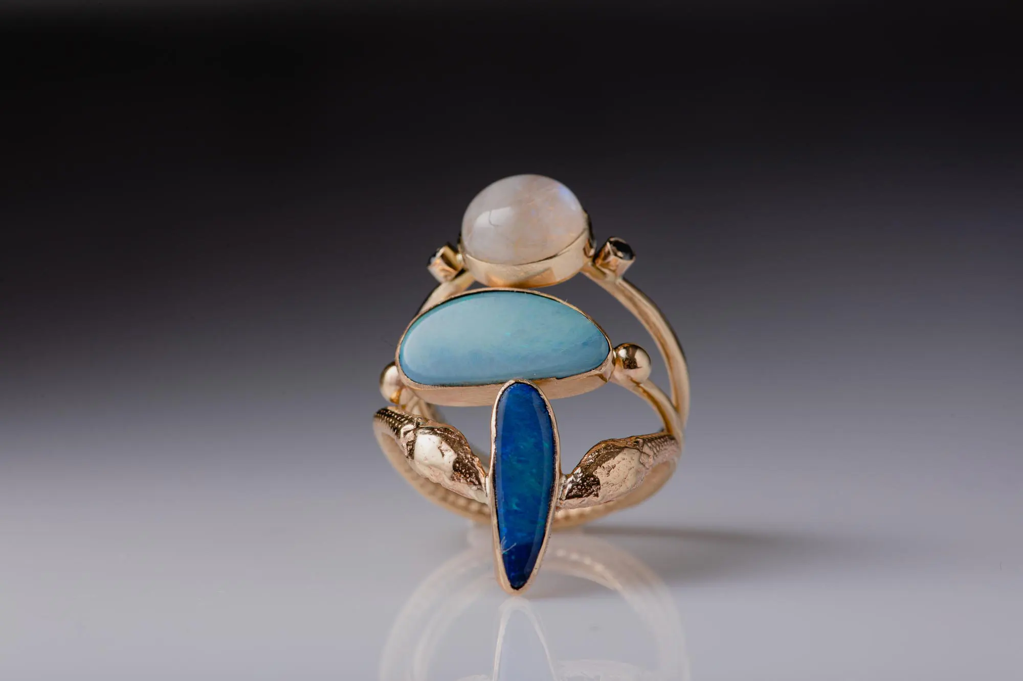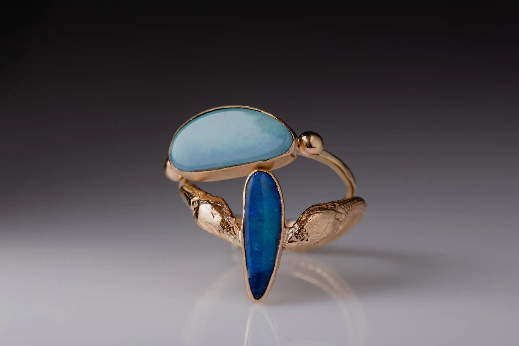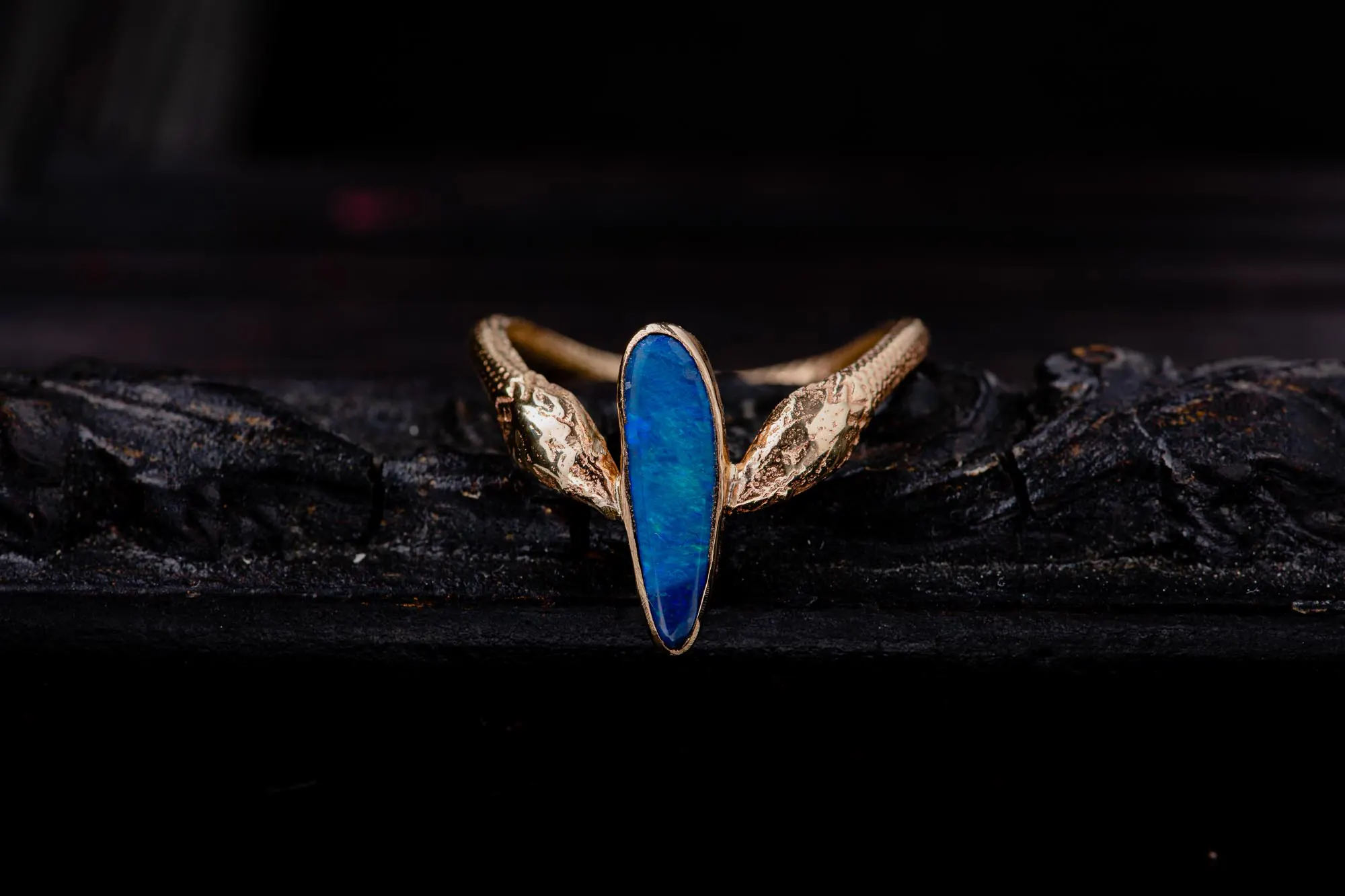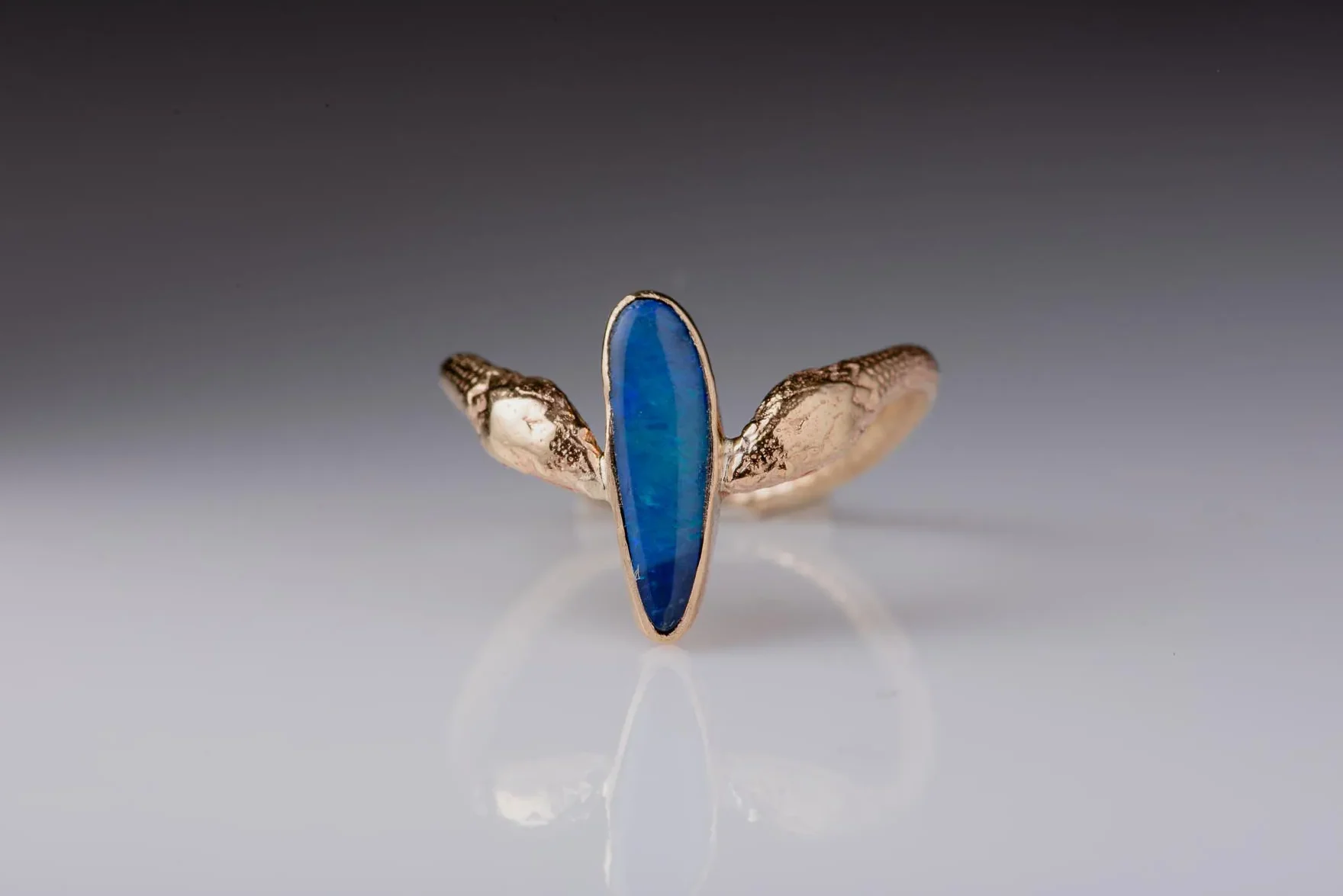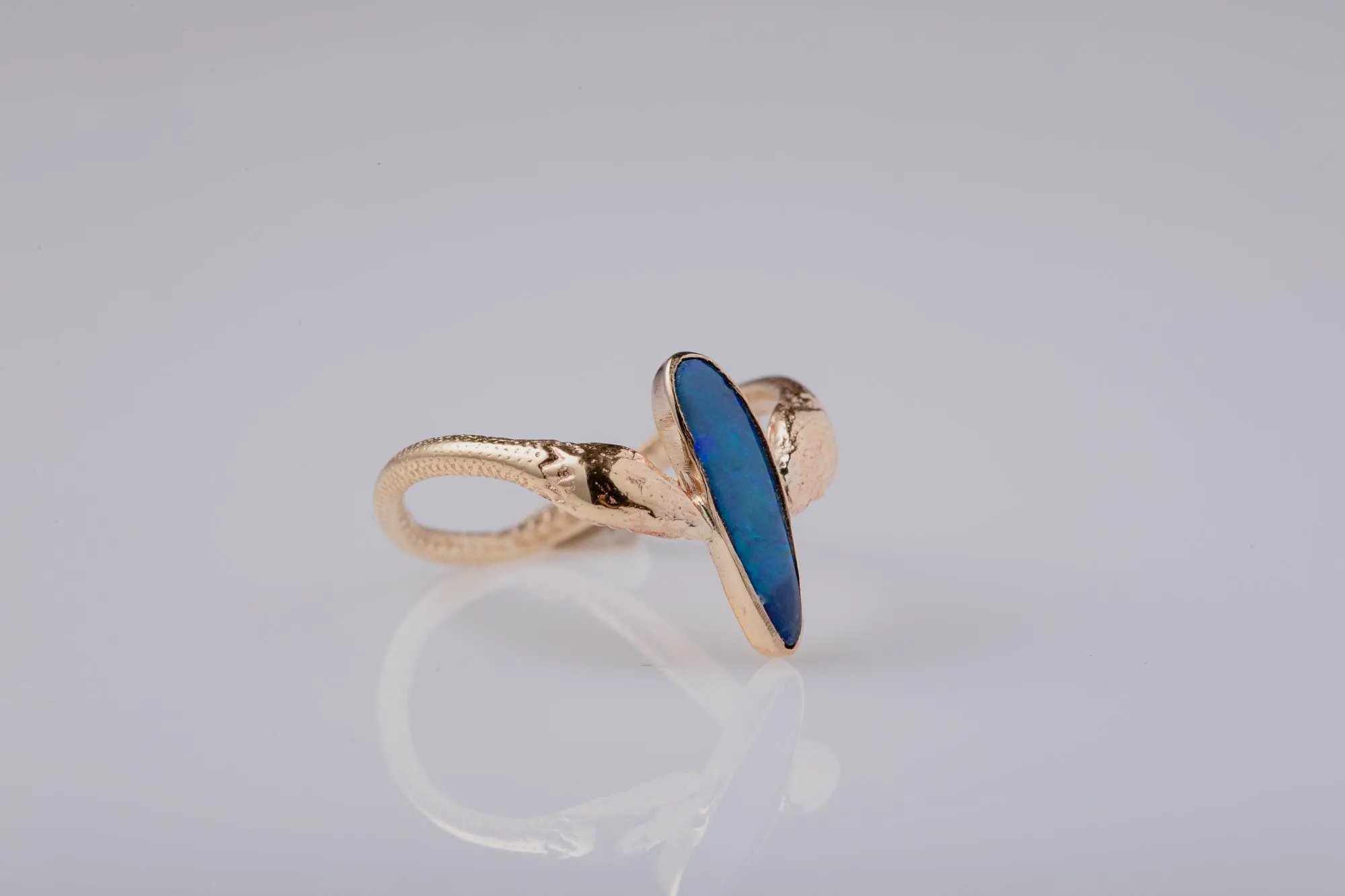 With references to Ancient Greek jewelry, this magical ring features a unique, odd-shaped opal set in 14K gold and adorned with detailed snakes.