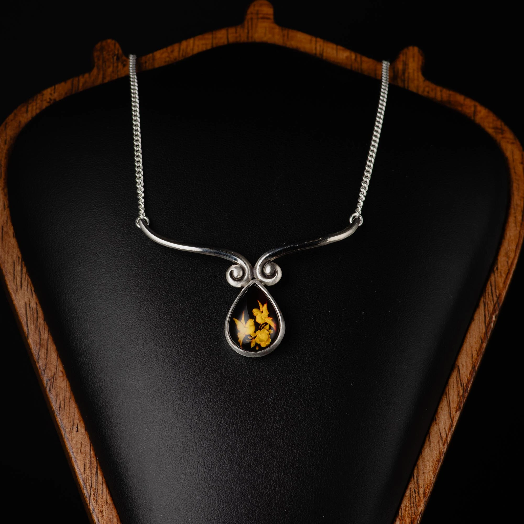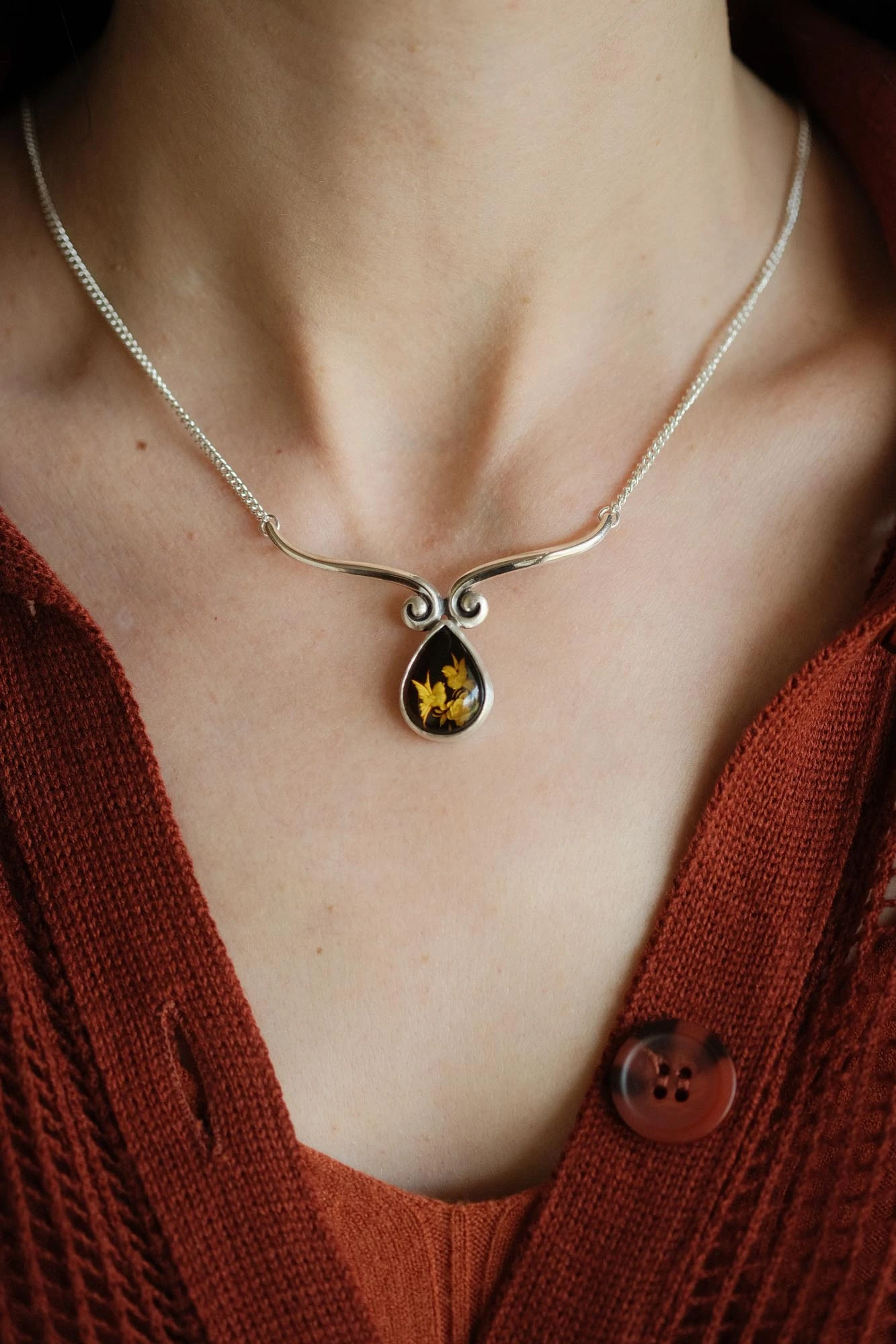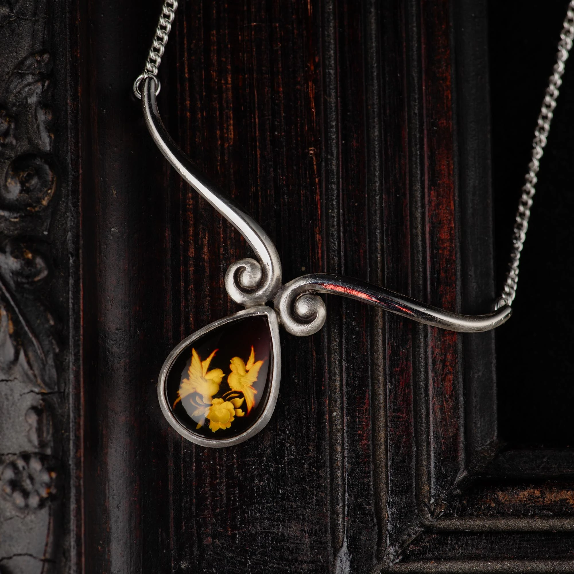 This Sterling Silver Amber Intaglio Necklace features a carved amber stone in a classic teardrop shape, bringing together warmth, detail, and a subtle sense of storytelling.