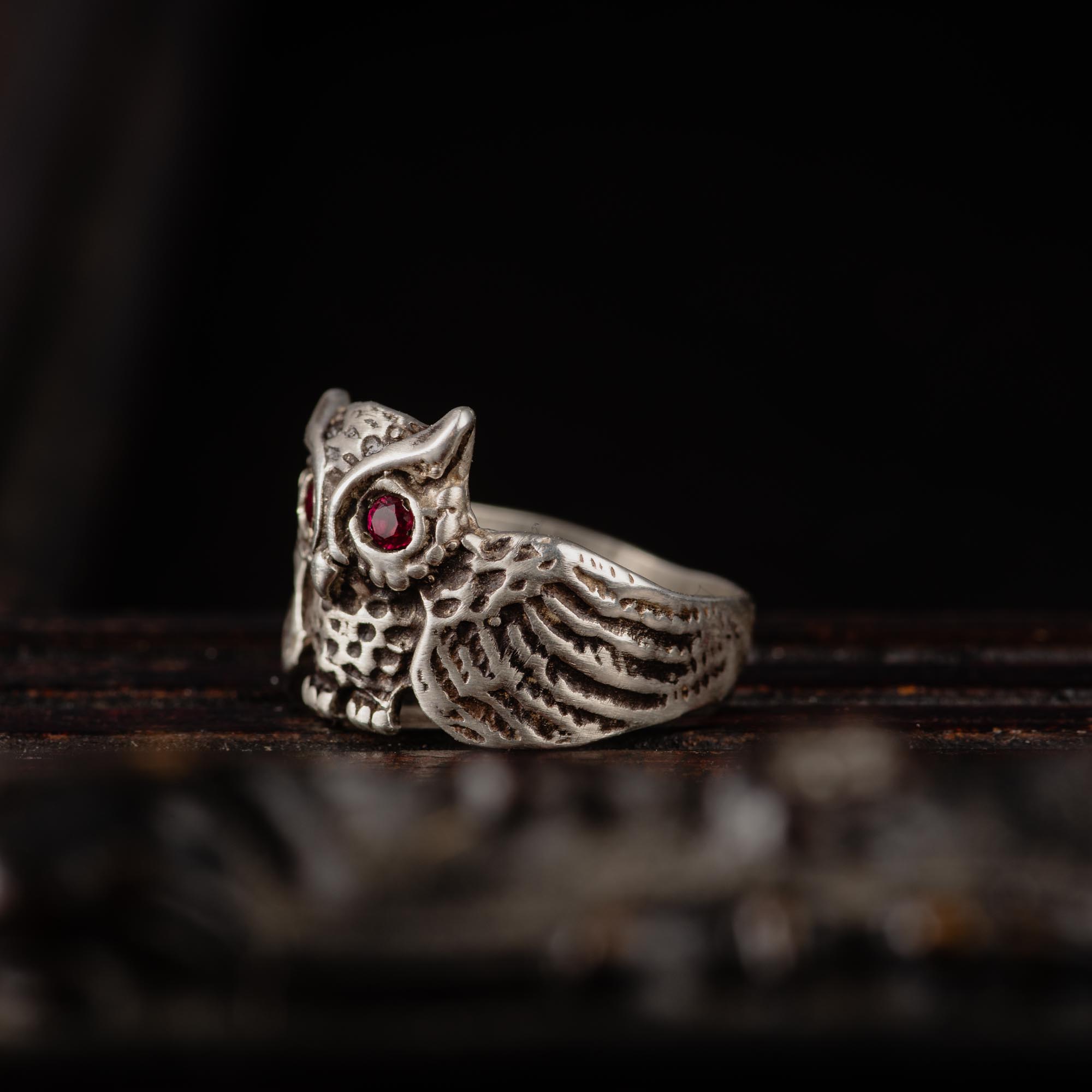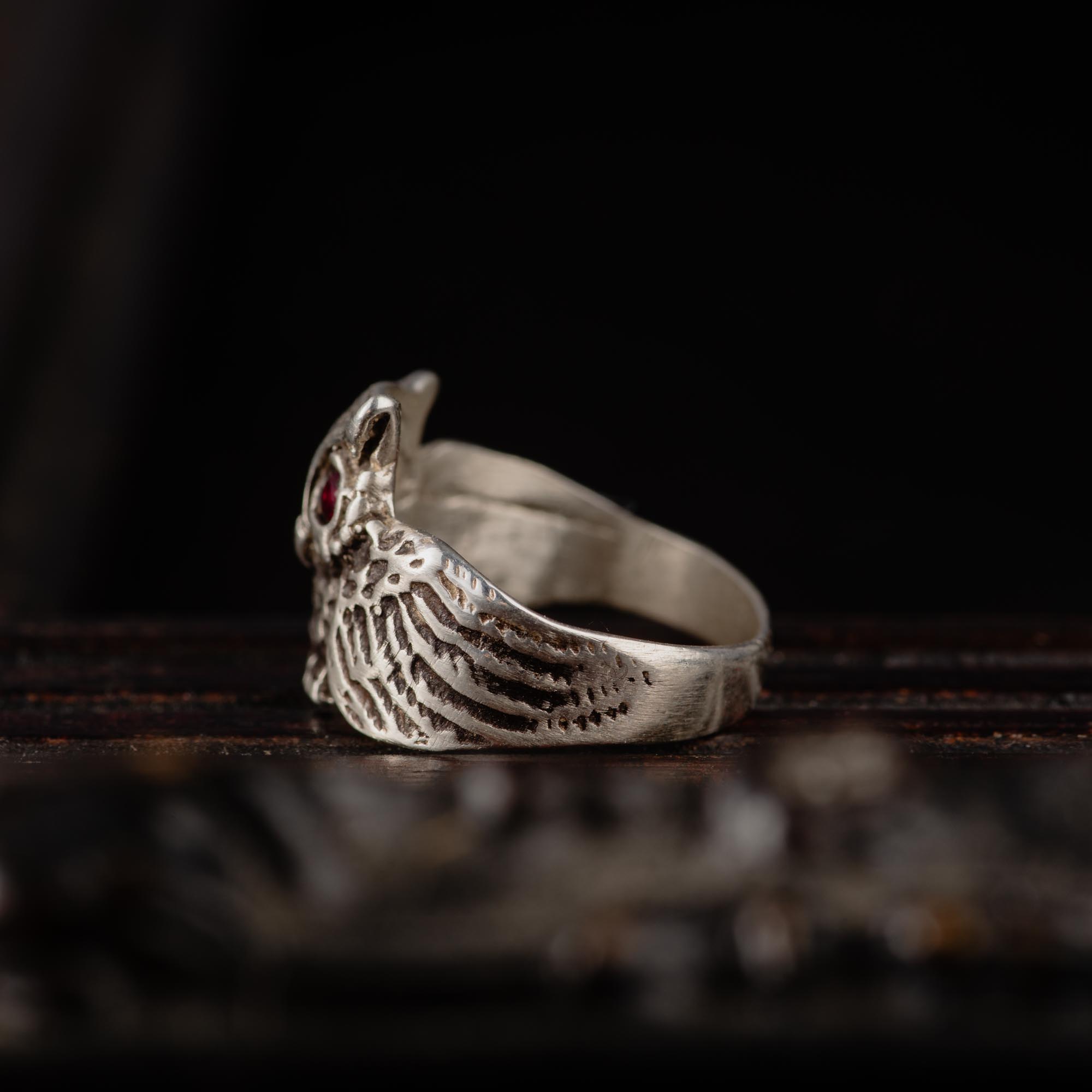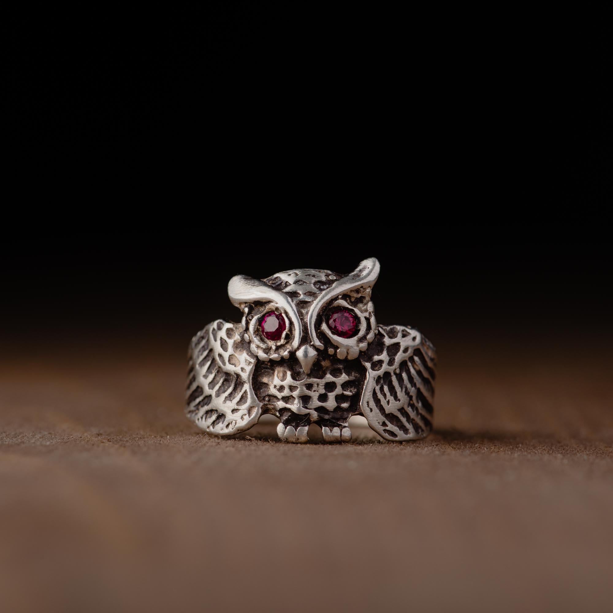 At the heart of the ring, two vibrant 2 mm pink rubies sparkle as the owl’s captivating eyes, adding a touch of warmth and mystique to the darkened silver finish.