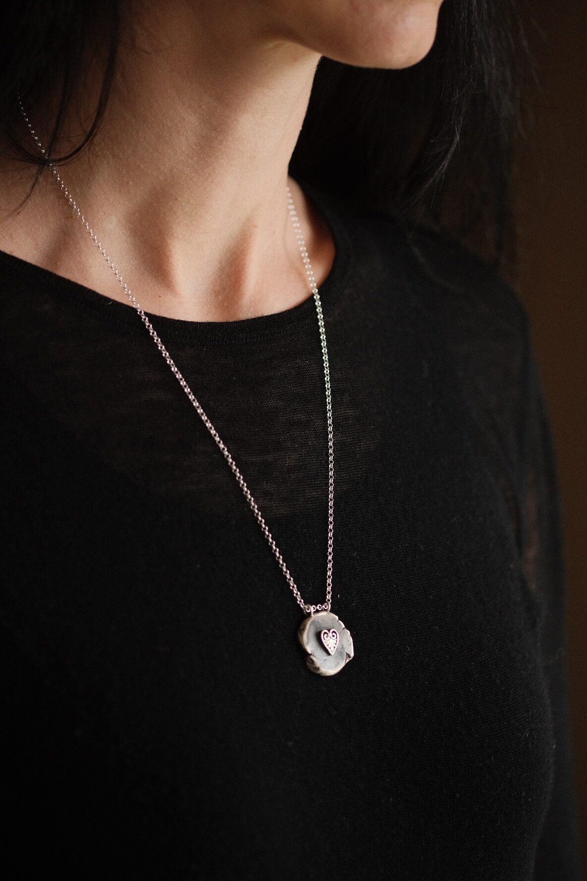 The organic round shape, reminiscent of an ancient seal, is intentionally irregular and slightly raw, giving the piece a sense of permanence and age. The pendant has a solid, substantial weight, offering a reassuring presence when worn, and its softly brushed matte surface subtly catches the light without being flashy.